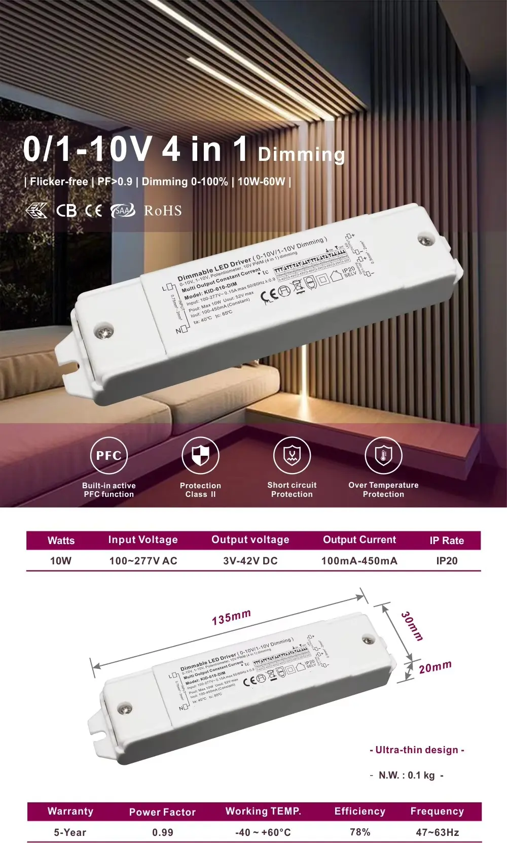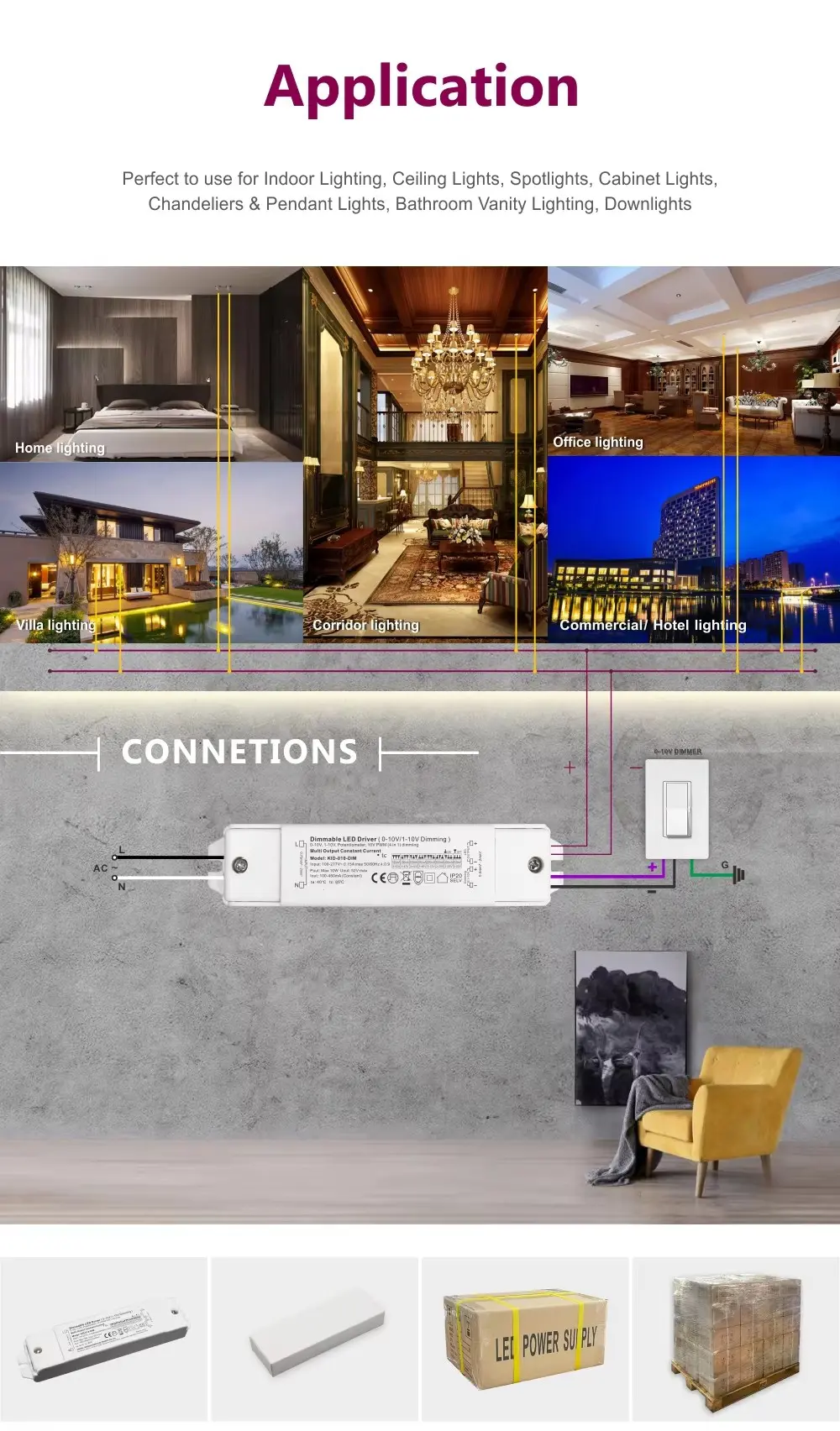 Construído para oferecer desempenho consistente, este dimmer suporta uma ampla saída de 3-42 Vcc, tornando-o compatível com uma vasta gama de módulos e faixas de LED de baixa tensão comuns. Sua aceitação de tensão de entrada de ampla faixa garante operação estável em vários ambientes elétricos. Capaz de conduzir cargas de 10 W a 60 W, é perfeitamente adequado para uma variedade de aplicações internas – desde iluminação de realce, sancas e iluminação de tarefas sob gabinetes em residências até iluminação ambiente mais exigente em hotéis, restaurantes e escritórios.