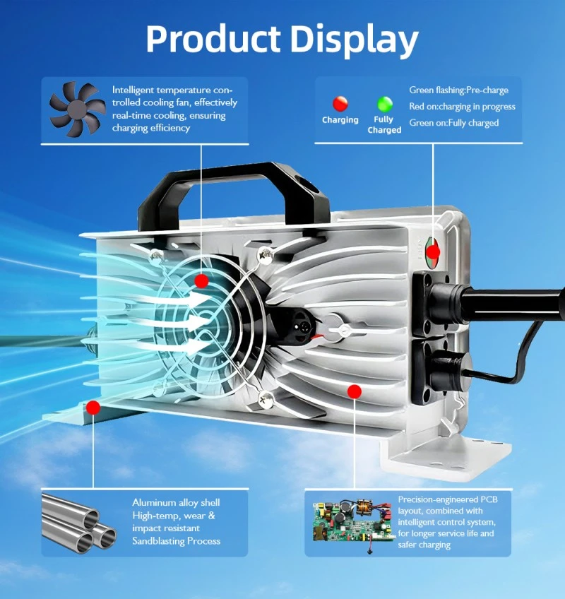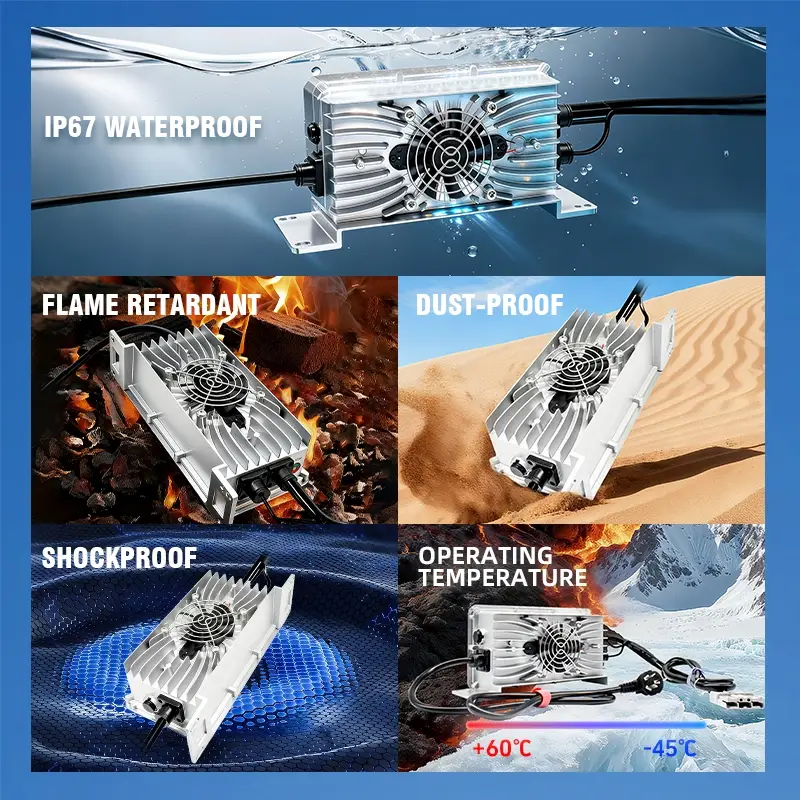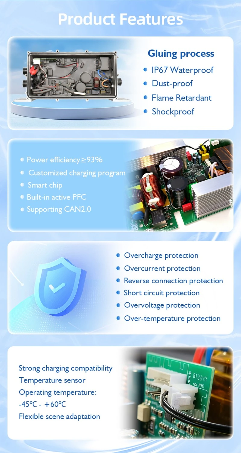 O invólucro totalmente em liga de alumínio aumenta a eficiência da dissipação de calor em 35% em comparação com os invólucros de plástico, mantendo a temperatura operacional do carregador abaixo de 60°C durante a operação contínua de 1,2 kW, protegendo assim os componentes internos e prolongando a vida útil. Além disso, está equipado com mecanismos de proteção de segurança multicamadas, incluindo proteção contra sobretensão (55 V máx.), proteção contra sobrecorrente (28 A máx.), proteção contra curto-circuito e proteção contra sobretemperatura, evitando eficazmente danos ao carregador e à bateria e garantindo uma operação segura em todos os ambientes a bordo.