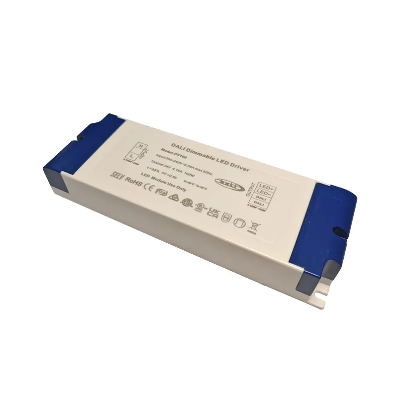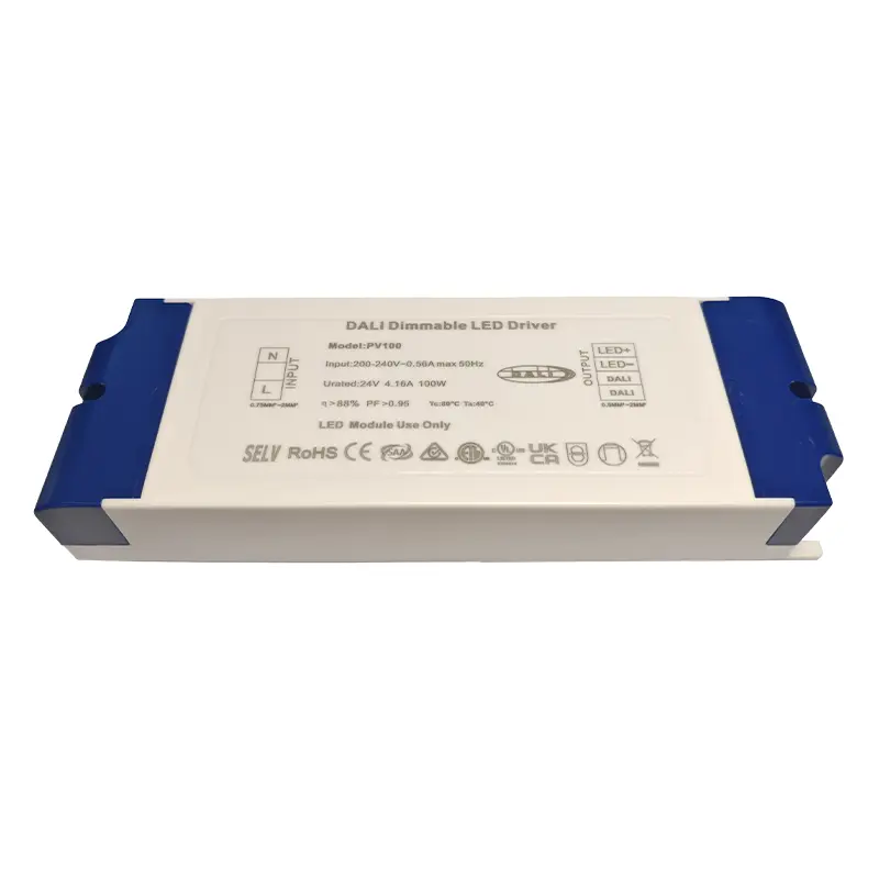 Como fabricante profissional de drivers DALI de tensão constante na China, a Starwell pode fornecer um driver DALI de tensão constante de 100 W de alta qualidade para aplicações reguláveis de 24 V, que oferece uma saída DC estável de 24 V/4,16 A com uma eficiência de até 90%. Ele suporta escurecimento suave e sem cintilação de 100% a 0,1% e possui funções abrangentes de proteção contra curto-circuito, sobretensão, sobrecarga e superaquecimento.