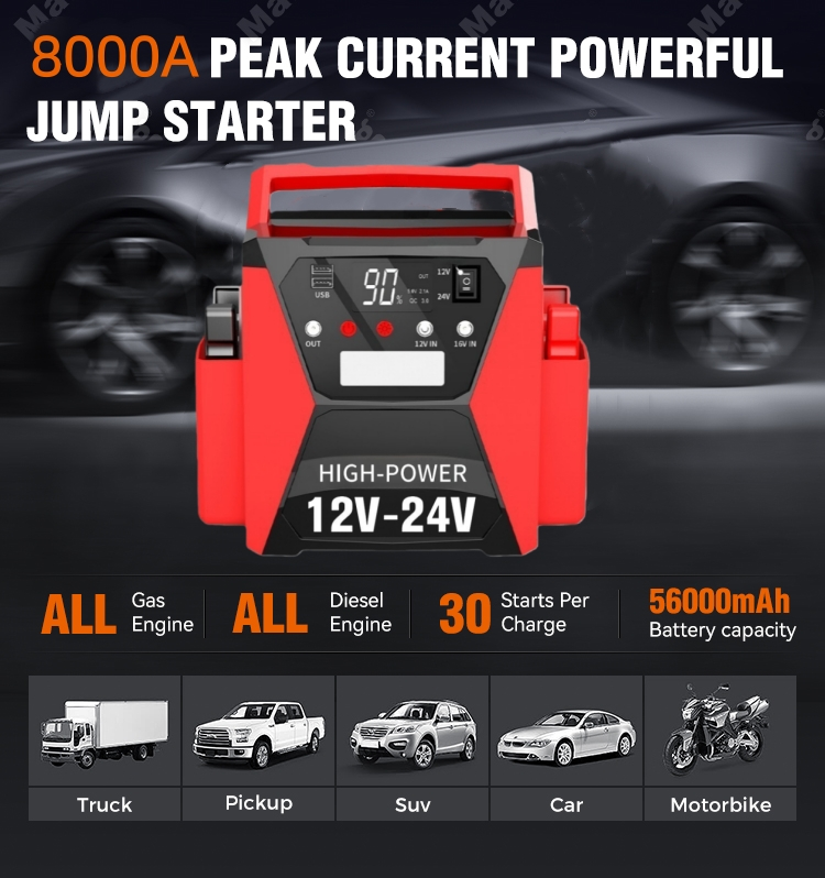 A STARWELL apresenta seu carregador de bateria inteligente 12V/24V Car Jump Starter de alto desempenho, uma virada de jogo para proprietários de veículos que buscam confiabilidade e inteligência na manutenção da bateria e partida de emergência. Equipado com uma corrente de pico de 8.000 A e uma corrente de partida de 4.000 A, este carregador de bateria inteligente de dupla voltagem combina potência robusta com tecnologia inteligente, tornando-o adequado para todos os motores a gasolina e diesel de até 15L, cobrindo carros, caminhões, trailers, motocicletas, barcos e até mesmo veículos comerciais pesados.