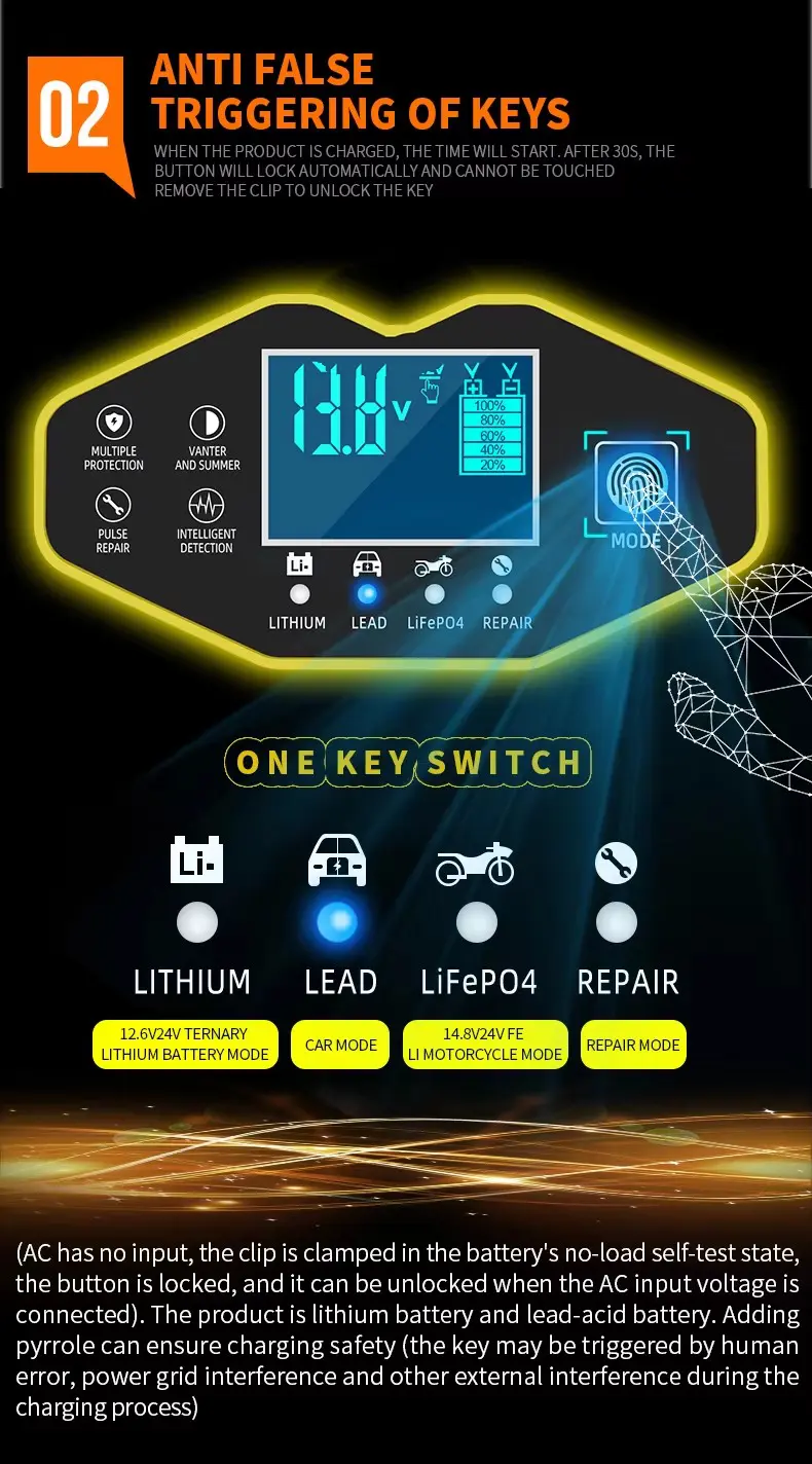 1. Inteligente e compatível O ZYX-J40 suporta quase todos os tipos de bateria do mercado, incluindo chumbo-ácido, AGM, Gel, EFB, Li-ion e LiFePO₄ (fosfato de ferro-lítio). Com uma ampla faixa de capacidade de 2Ah a 150Ah, ele suporta tudo, desde pequenas baterias de motocicletas até grandes baterias de automóveis.