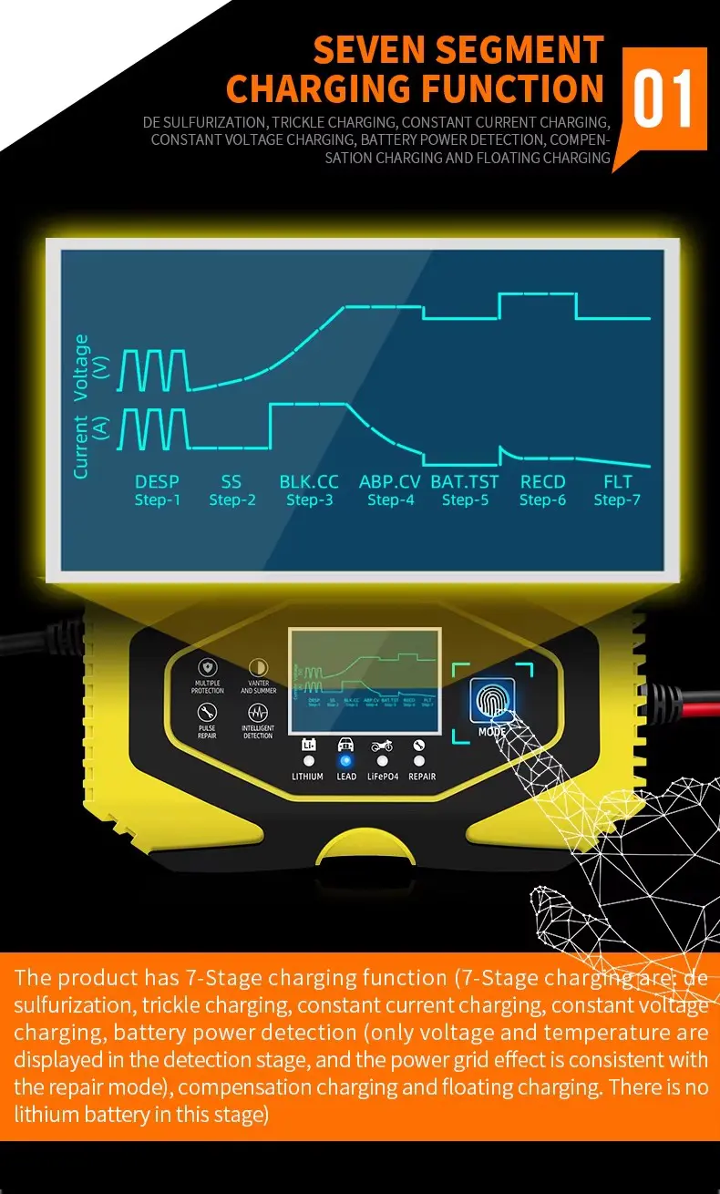 Os carregadores de 7 estágios são adequados para a maioria dos tipos de baterias, incluindo cálcio, gel AGM, úmida e de lítio. Ácido Chumbo. Baterias LifePo4. Eles também podem ajudar a restaurar baterias descarregadas e sulfatadas.