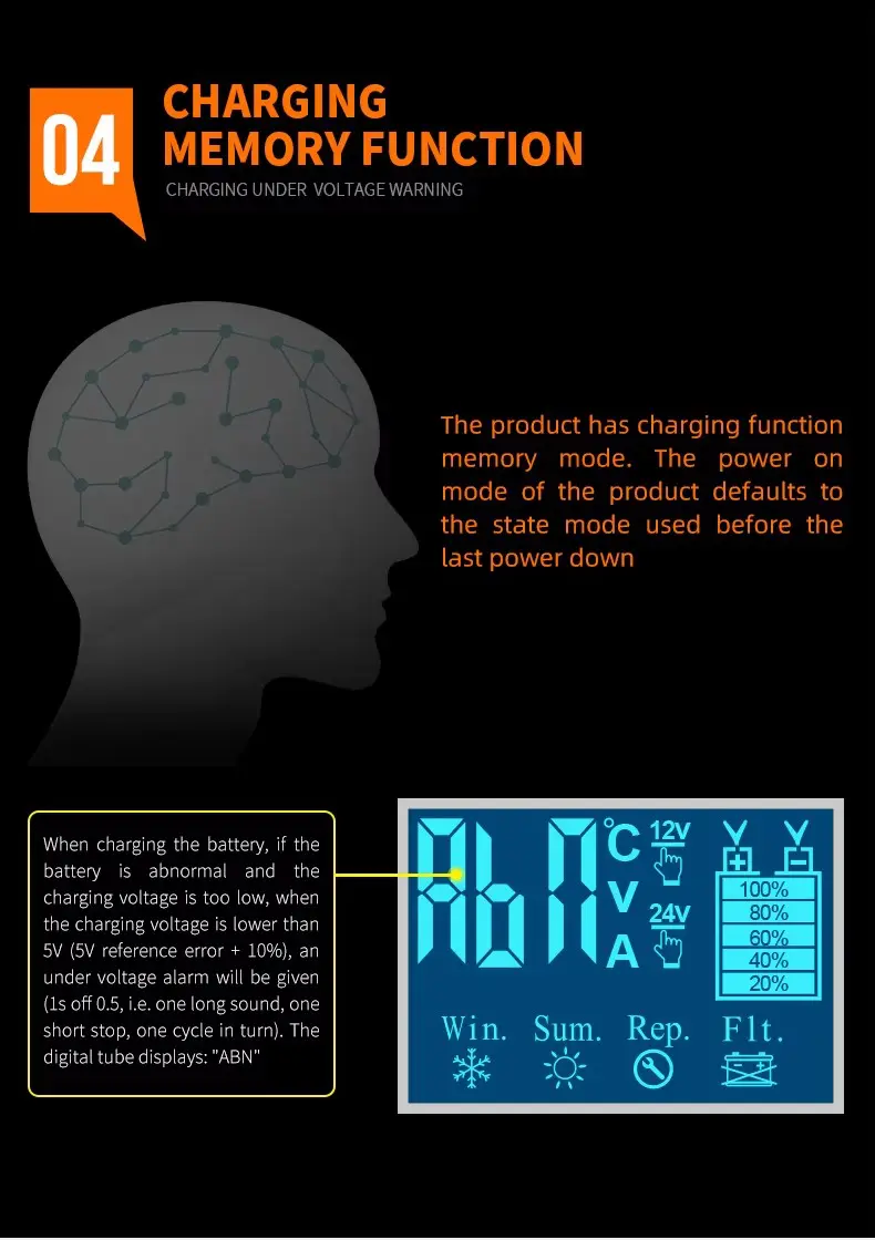 2. Desempenho de carregamento otimizado Este carregador fornece 12V a 6A e 24V a 3A, com uma potência máxima de 110W e 85% de eficiência de carregamento sob carga total. O programa de carregamento inteligente automático de 7 estágios inclui dessulfatação, partida suave, carregamento em massa, absorção, análise, recondicionamento e manutenção de flutuação. Um modo de inverno dedicado garante um carregamento seguro em temperaturas frias, enquanto o display LCD permite monitorar a tensão de carga, a corrente e a temperatura da bateria em tempo real.