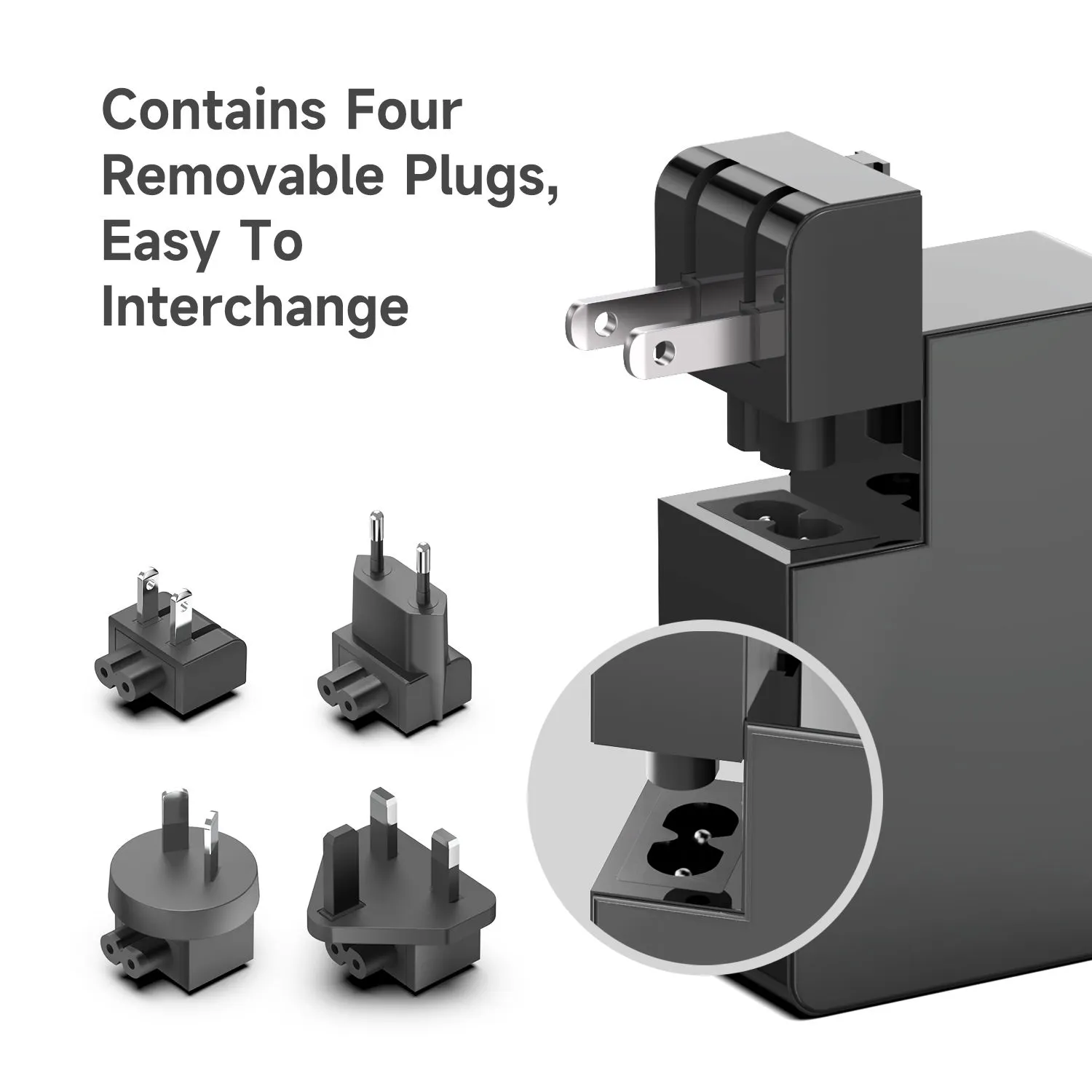 Plugues multipadrão: o adaptador de energia STARWELL está equipado com 4 tipos de plugues snap-in (EUA, UE, Reino Unido e UA), sem necessidade de conversores adicionais para viagens internacionais.