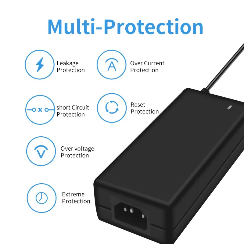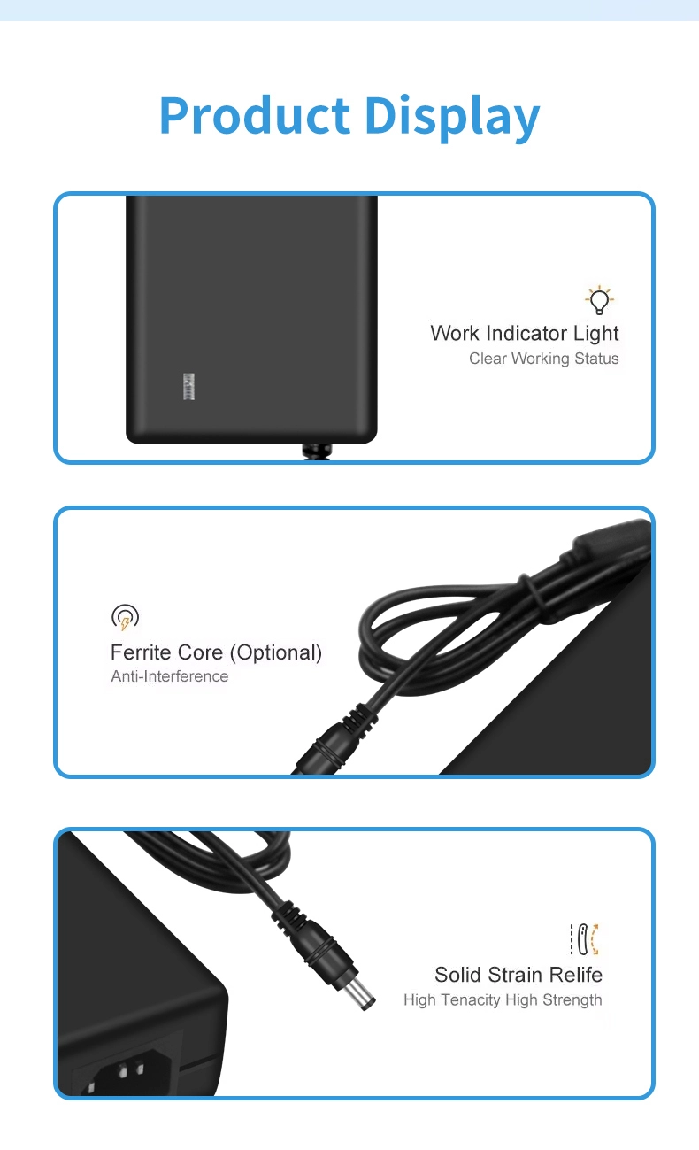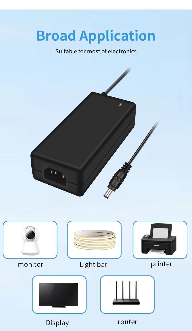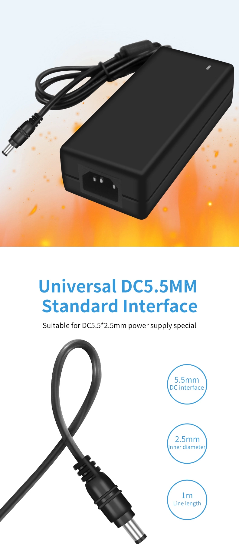 A ampla entrada de tensão CA 100-240V é compatível com redes elétricas em mais de 100 países em todo o mundo. O cabo de saída estendido de 1,5 m (1,0 mm² de diâmetro) emparelhado com um conector DC giratório de 180° se adapta a vários cenários de instalação. Com um tamanho compacto de apenas 120×60×30mm, é 35% menor que os adaptadores tradicionais da mesma potência, pesando apenas 280g – melhorando a portabilidade em 50%.