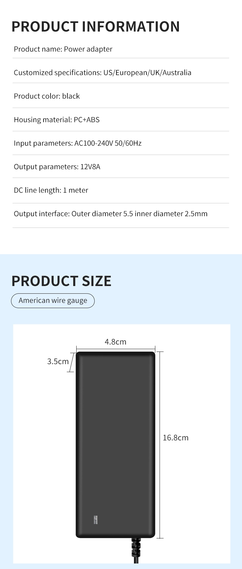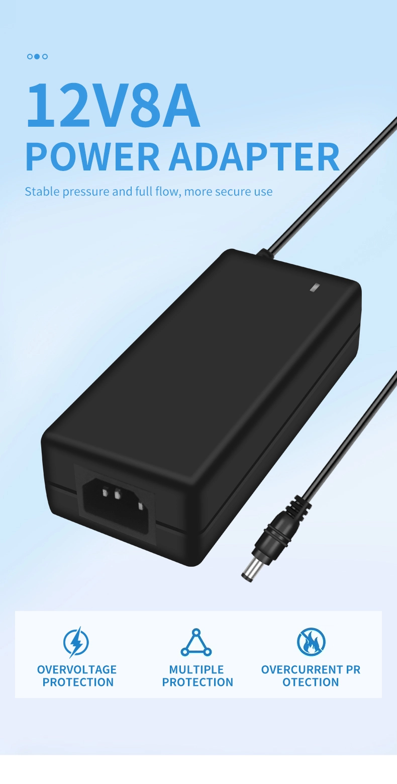 Com uma potência nominal de 96 W, a corrente de saída do adaptador de energia de 96 W se estabiliza em um pico de 8A e a precisão da tensão é controlada dentro de ± 5% (tensão sem carga: 12,1 V; tensão de carga total: 11,8 V). Ele pode atender às necessidades simultâneas de fonte de alimentação de vários dispositivos (por exemplo, 2 dispositivos paralelos de 48 W). O cabo de saída com núcleo de cobre puro garante uma queda de tensão de ≤0,3V, mantendo o desempenho não atenuado durante a transmissão de alta corrente.