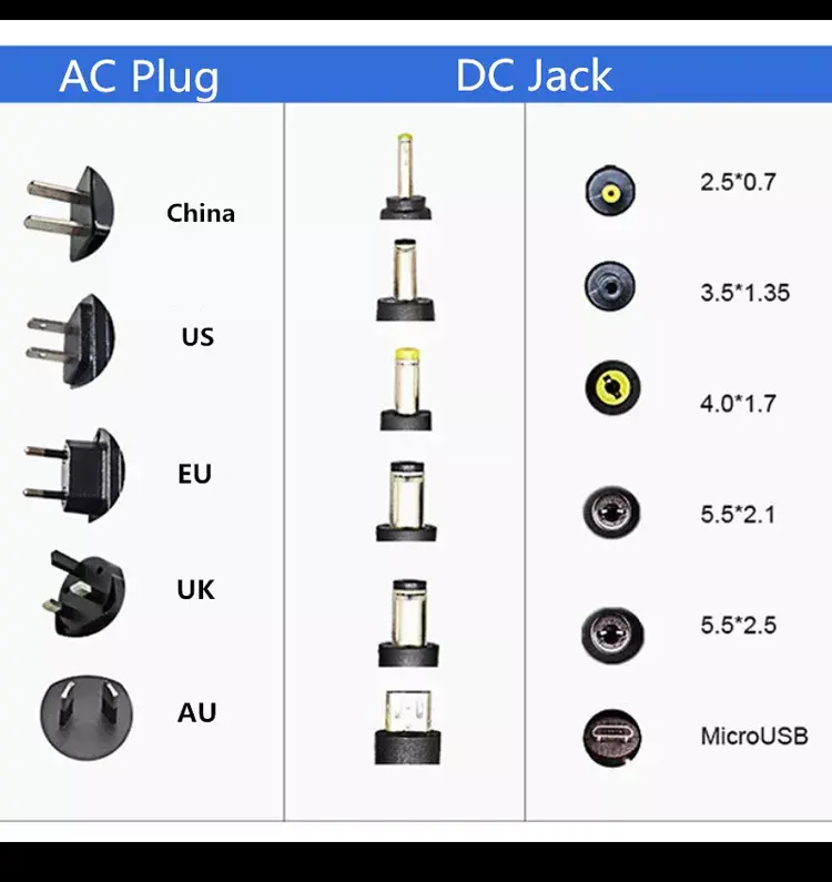 Tipo de conector: conector cilíndrico DC padrão (os tamanhos comuns incluem 5,5 mm × 2,1 mm ou 5,5 mm × 2,5 mm, personalizáveis com base nos requisitos do dispositivo).