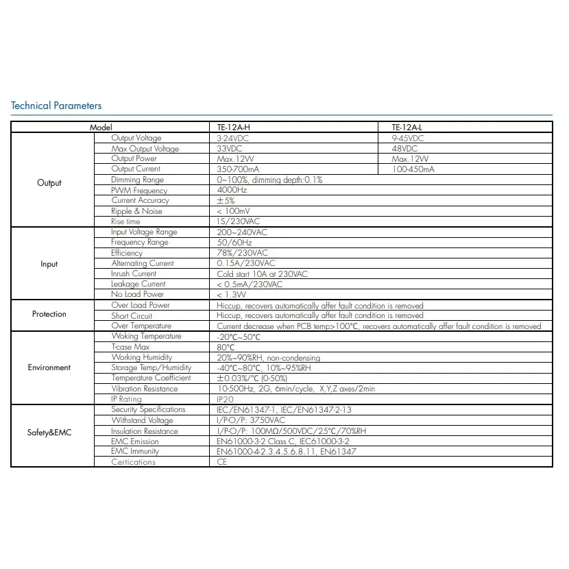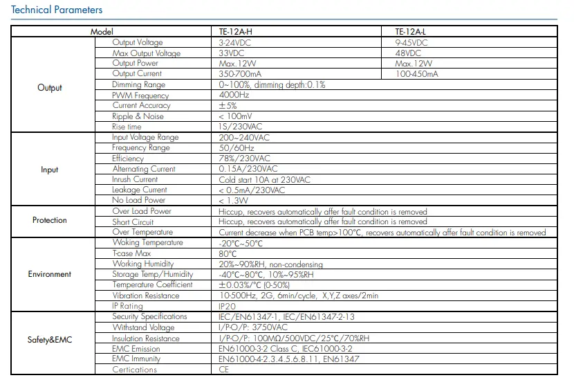 Tensão de entrada: 200-240 VCA 50-60 Hz Corrente de entrada: 0,15A Potência de saída: 12 Watts máx. Tensão de saída: 9 ~ 42V Garantia: 2 anos Certificado:CE/Rohs
