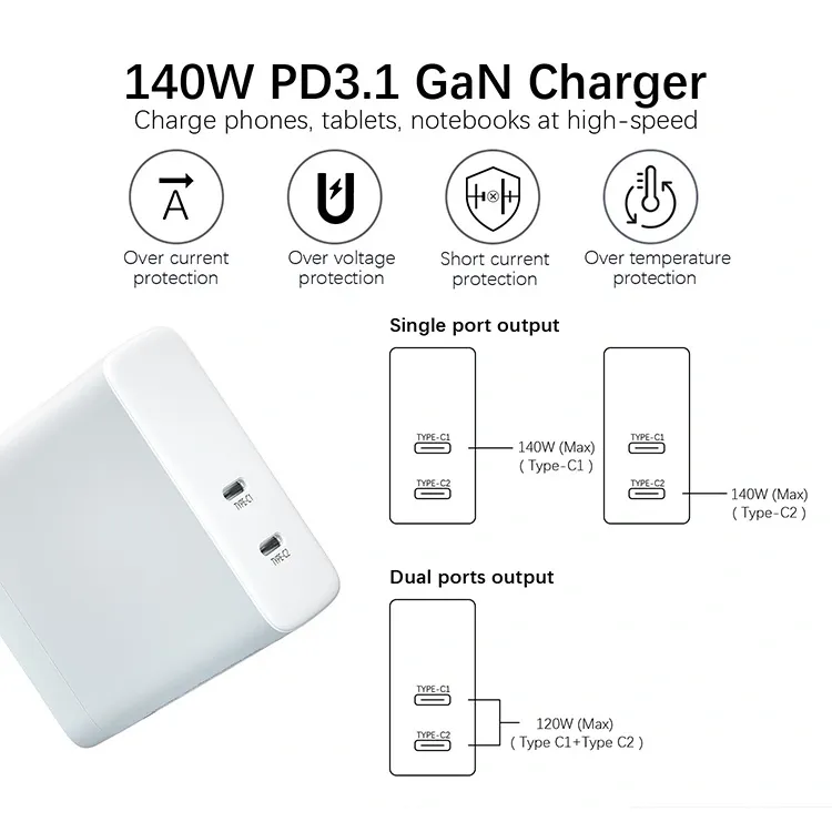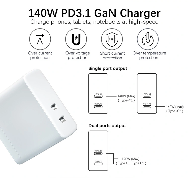Carregador PD de porta USB C dupla de 140 W Plugue americano dobrável: A porta única pode fornecer até 140 W de potência. A potência de saída das portas duplas é alocada simultaneamente de forma inteligente. Ao carregar um laptop e um celular ao mesmo tempo, a eficiência permanece inalterada.
