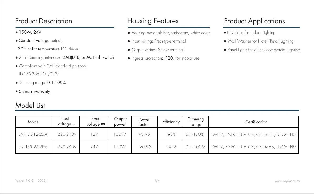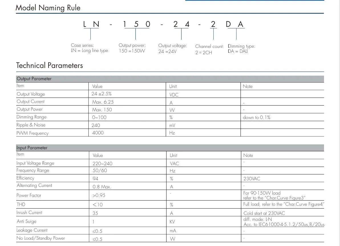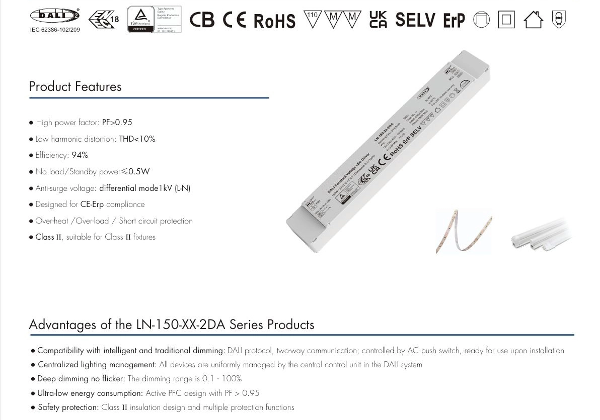 Isolamento duplo: 150W 24V DALI CCT LED de tensão constante é composto de isolamento básico e isolamento adicional, formando duas camadas independentes de proteção de isolamento, mesmo se uma camada falhar, a outra camada ainda pode evitar choque elétrico