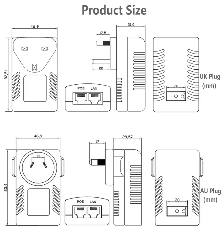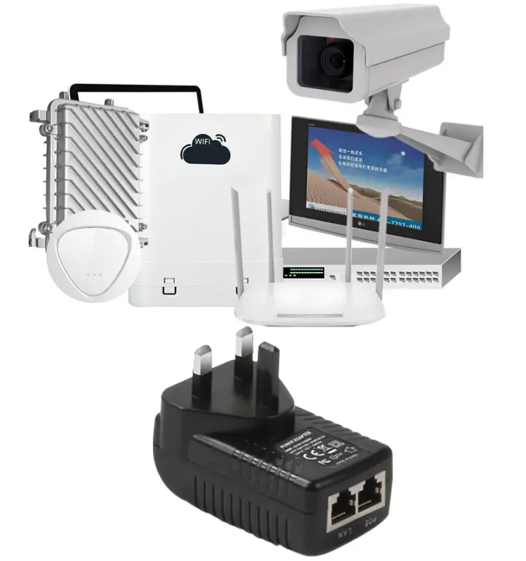 A estrutura compacta do plugue de parede permite o uso direto com tomadas de energia padrão, sem necessidade de suportes ou fiação extras. Este injetor POE 24V 1A 48V 0,5A economiza espaço e simplifica o cabeamento, tornando-o a escolha ideal para residências, escritórios, lojas e pequenos sistemas de vigilância.