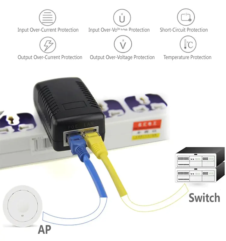 O injetor POE de 2 portas fornece tensão e corrente estáveis com baixa ondulação, garantindo uma operação estável a longo prazo. Ampla tensão de entrada de 100–240 VCA adapta-se às redes elétricas globais. A proteção integrada contra sobretensão, sobrecorrente, curto-circuito e superaquecimento protege tanto o injetor POE de porta dupla quanto o equipamento conectado.