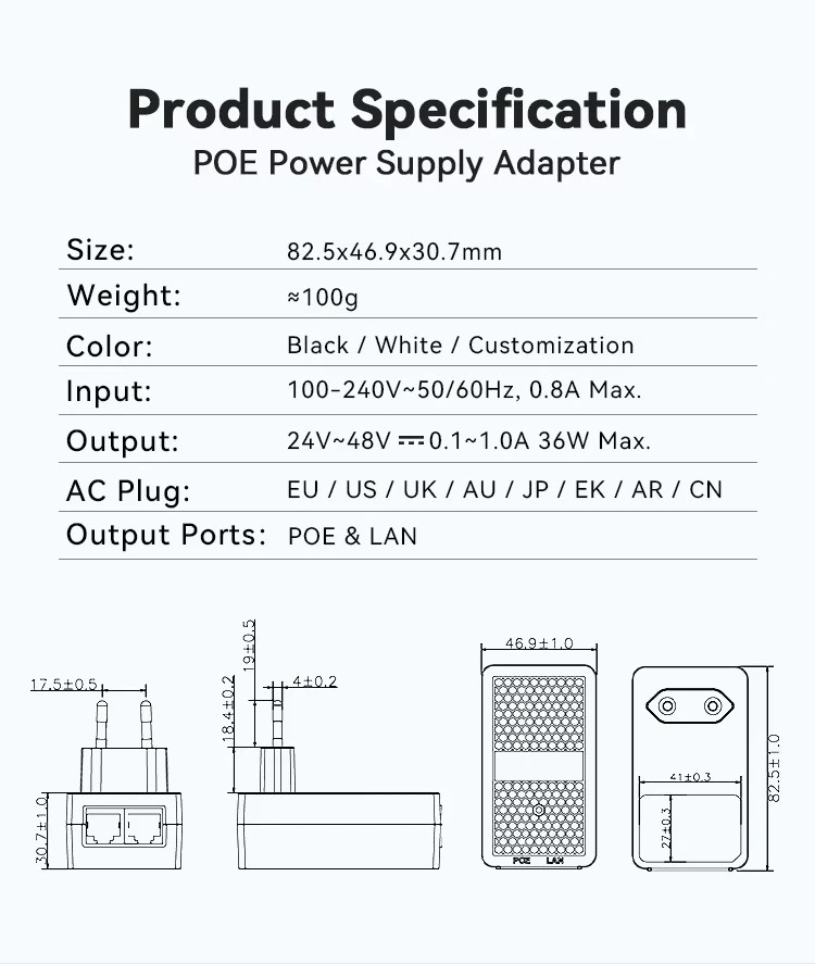 O injetor POE de plugue UE 24V 1A montado na parede de fábrica da STARWELL possui entrada CA universal (100-240V) com saídas selecionáveis: 24V/0,5A, 24V/1A ou 48V/0,5A. Ele suporta protocolos PoE passivos e ativos, com atribuições de pinos flexíveis, incluindo Midspan (4,5+/7,8-) e Endspan (1,2+/3,6-). Totalmente compatível com os padrões IEEE802.3af/at/bt PoE++, oferece capacidades excepcionais de velocidade de dados que variam de 10/100/1000M a 2,5G/5G/10G bps.