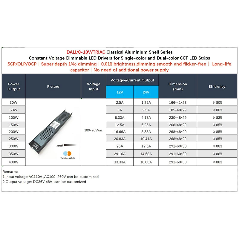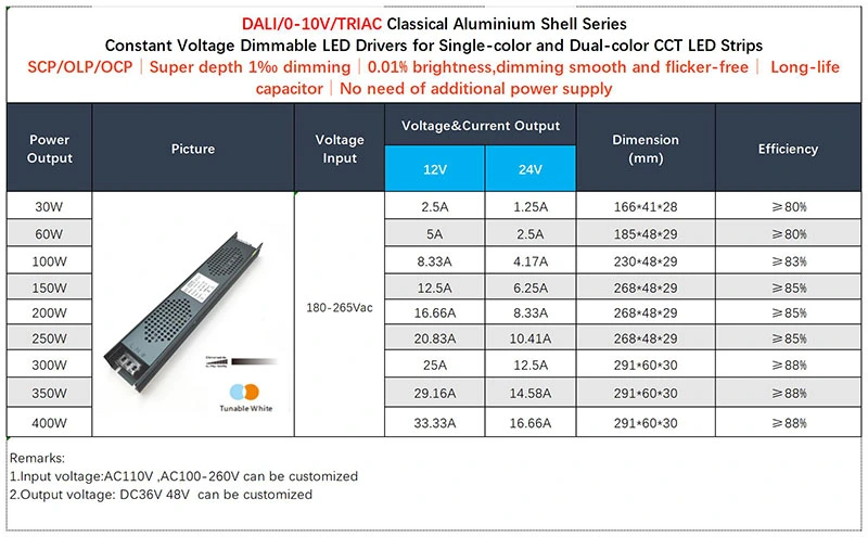 Este driver de LED regulável DALI CCT de tensão constante oferece saída de 12/24 VCC com tolerância de tensão de ± 1% e corrente máxima de 2,5 A, equipado com 4 proteções de segurança de recuperação automática e operação estável de -20 ℃ a + 45 ℃. Com classificação IP20, certificação CE/TUV/RoHS e MTBF de 190.900 horas, este driver LED regulável DALI CCT de tensão constante garante desempenho durável e seguro em vários cenários de iluminação interna.