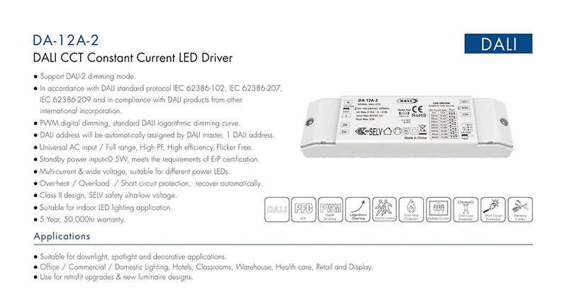 Este driver de LED regulável DALI CCT de tensão constante de 30 W está em conformidade com o protocolo DALI-2 DT8, suportando escurecimento CCT ultra suave sem cintilação de 0,1% -100% e controle de canal duplo de um endereço. Ele combina perfeitamente com todos os controladores principais DALI convencionais para programação de cena e controle de grupo, atendendo perfeitamente às demandas precisas de regulação da iluminação inteligente profissional.