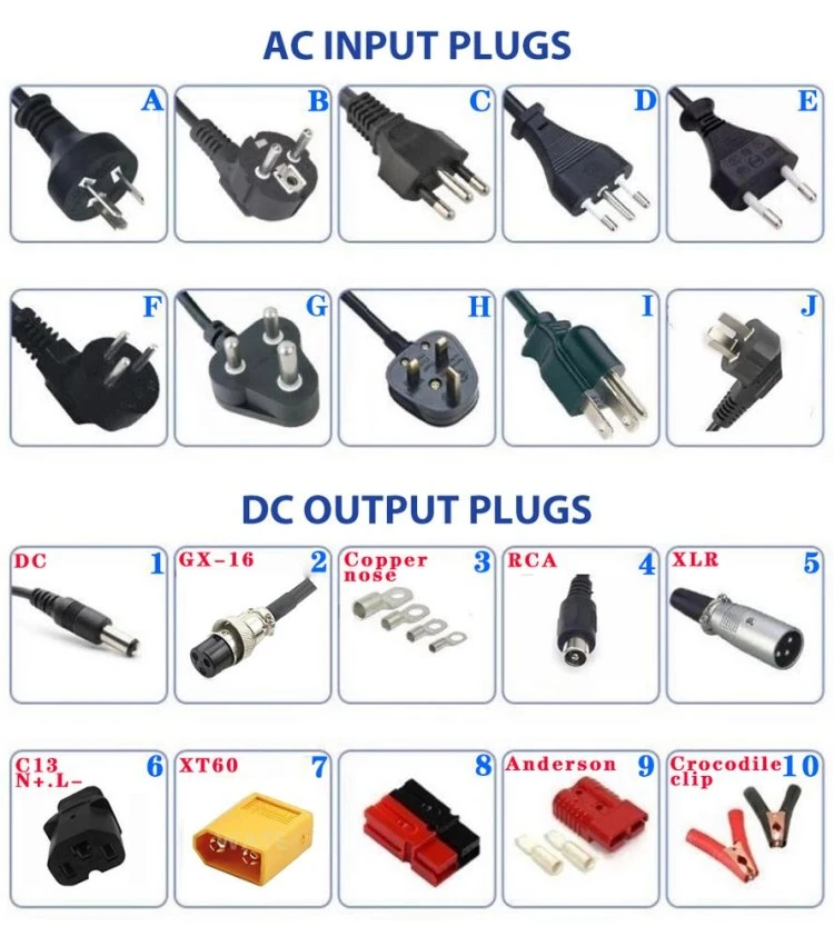 Proteção contra queima: A temperatura do carregador excede o limite. A carga diminuirá a carga de energia. A temperatura ambiente excede 65 ℃, o carregador irá parar de carregar e mudar para o modo de espera até que a temperatura ambiente diminua. Proteção para conexão reversa de baterias: O circuito dentro do carregador desliga com as baterias quando as baterias são conectadas inversamente e não danificará o carregador. Proteção sem carga: Não há saída quando as baterias não estão conectadas. Proteção contra curto-circuito: O circuito dentro do carregador é desligado com as baterias quando a saída está em curto-circuito. O carregador começará a carregar somente após a solução de problemas e reiniciará o carregador. Desligamento automático quando totalmente carregado: O carregamento é desligado automaticamente depois que a bateria está totalmente carregada, de acordo com a avaliação do carregador. |