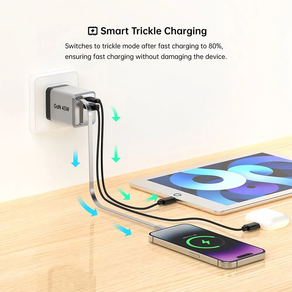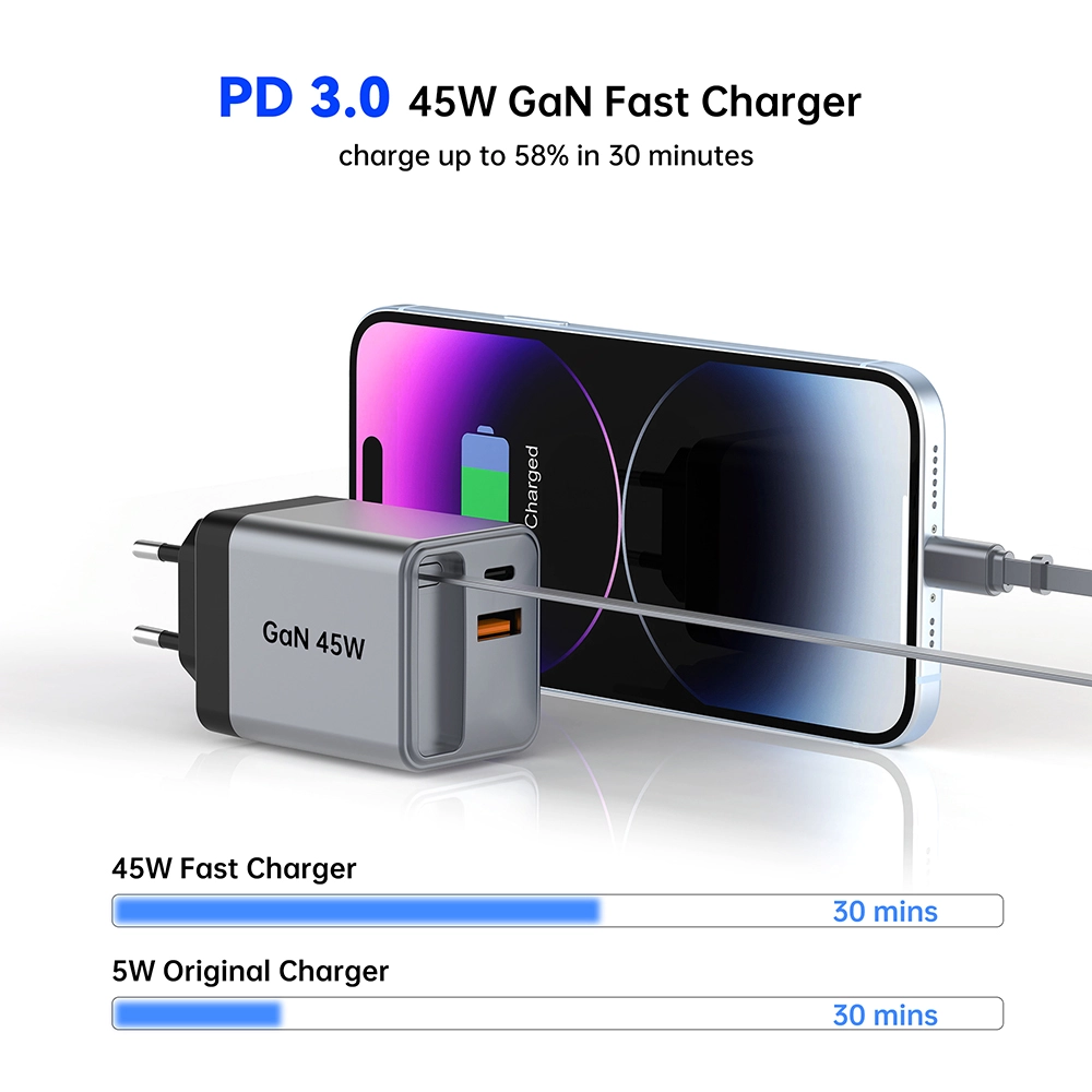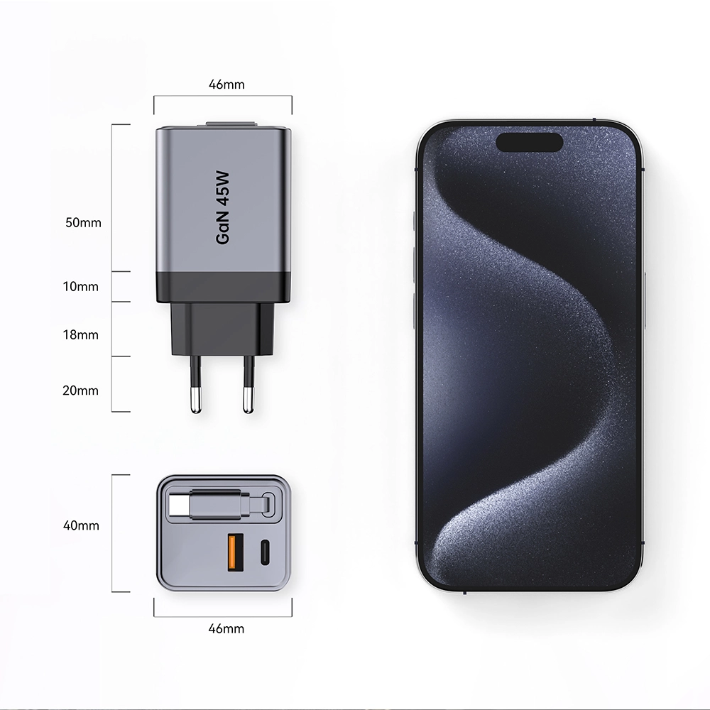 Carregamento de alta velocidade: o carregador rápido retrátil GAN 45W possui uma potência poderosa de 45 watts, garantindo carregamento rápido para seus dispositivos.