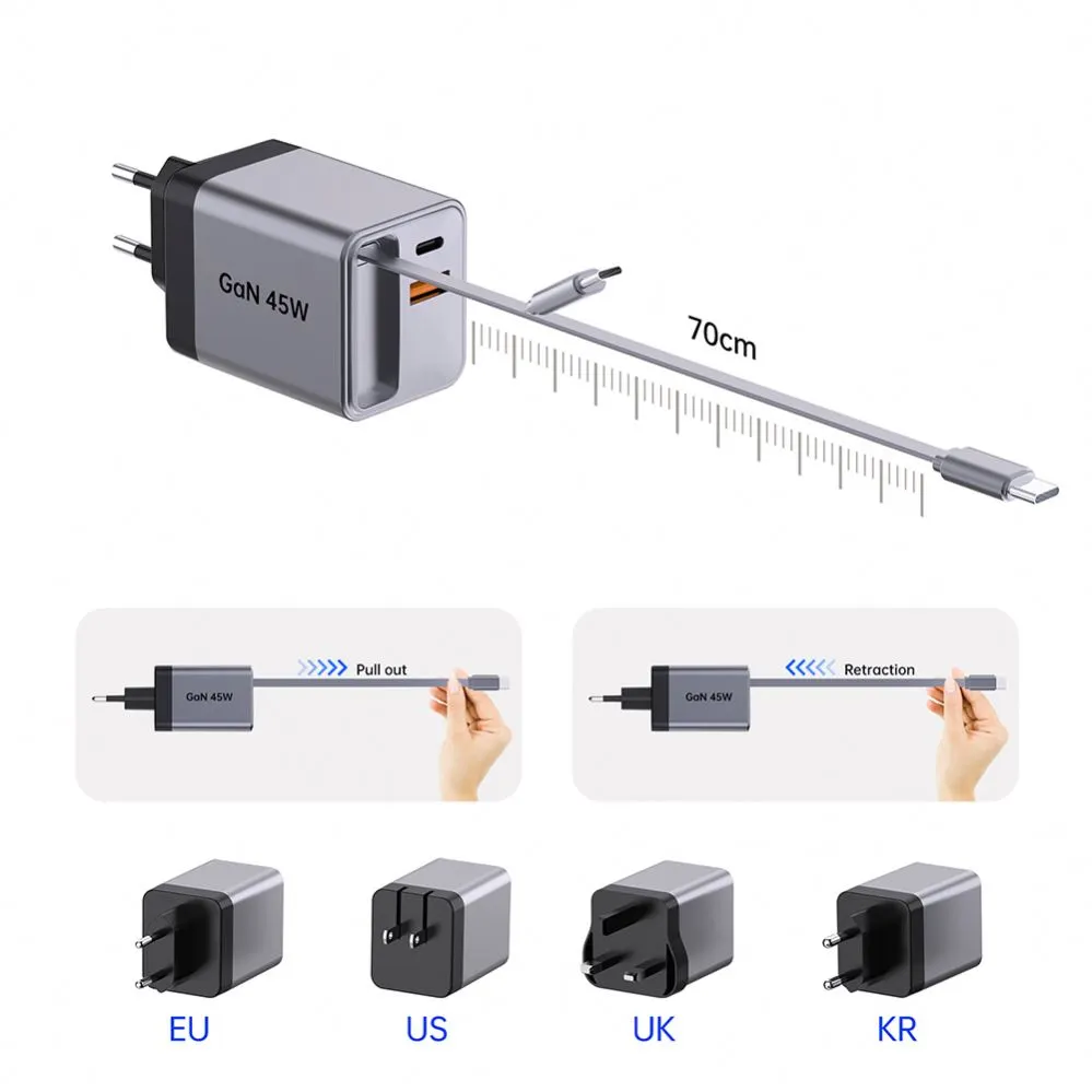 Carregador PD de tomada AC 45W UE com cabo retrátil tipo c Descrição do produto