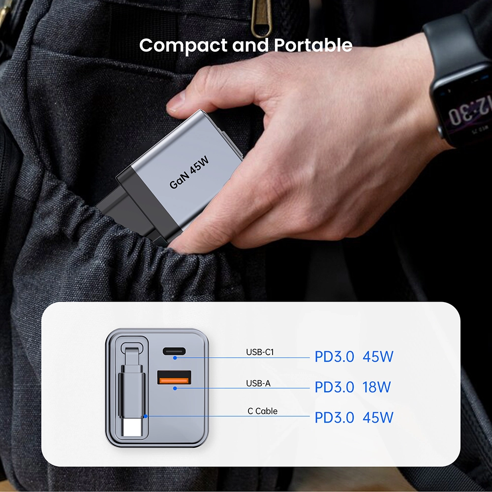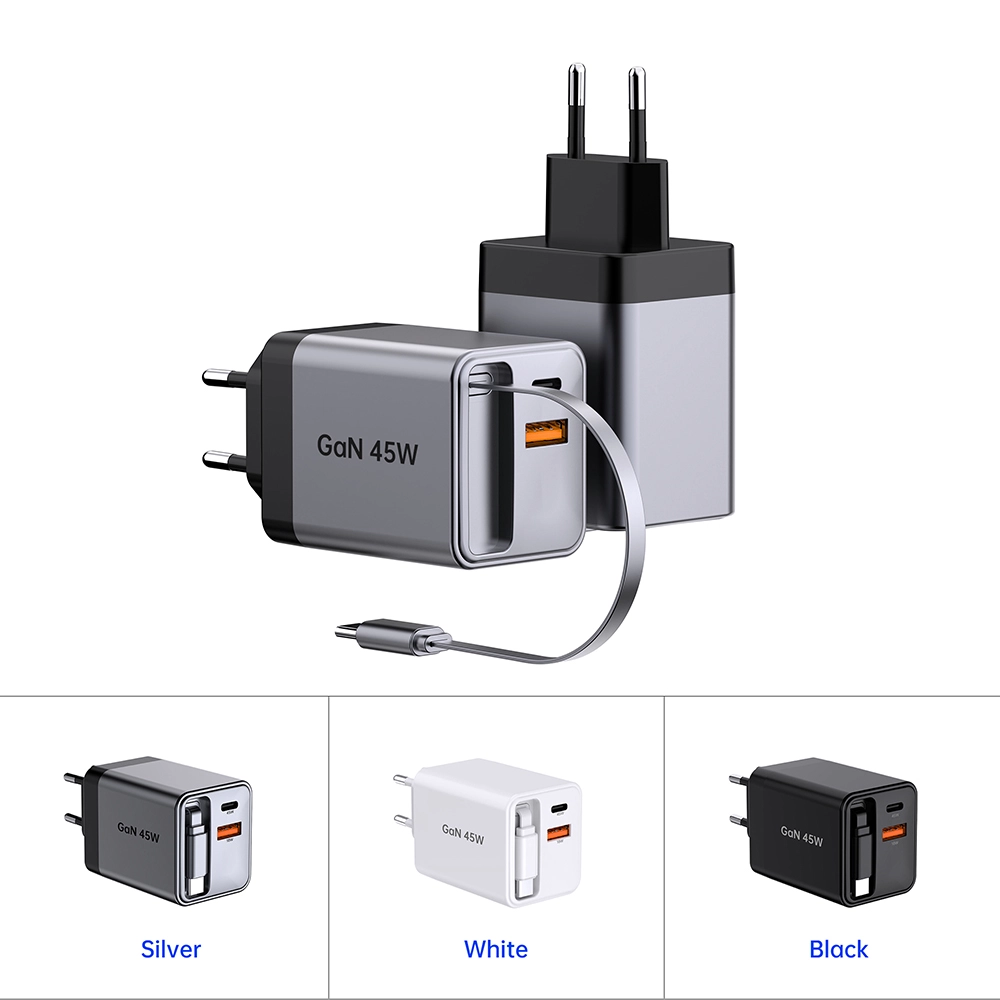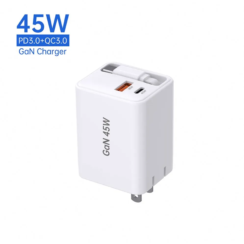 Carregador rápido retrátil GAN 45W USB-CABLE+USB-A+USB-C 45W PD Carregador com cabo