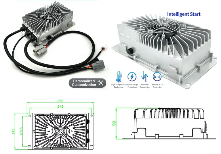O carregador OBC 24V 15A de 480 W é perfeito para carros elétricos, motocicletas, veículos turísticos, empilhadeiras, embarcações marítimas e máquinas industriais. Seu design durável e amplo suporte de bateria fazem dele a escolha preferida para fabricantes, fornecedores e fábricas que buscam atualizar os sistemas de carregamento de veículos elétricos com desempenho confiável.