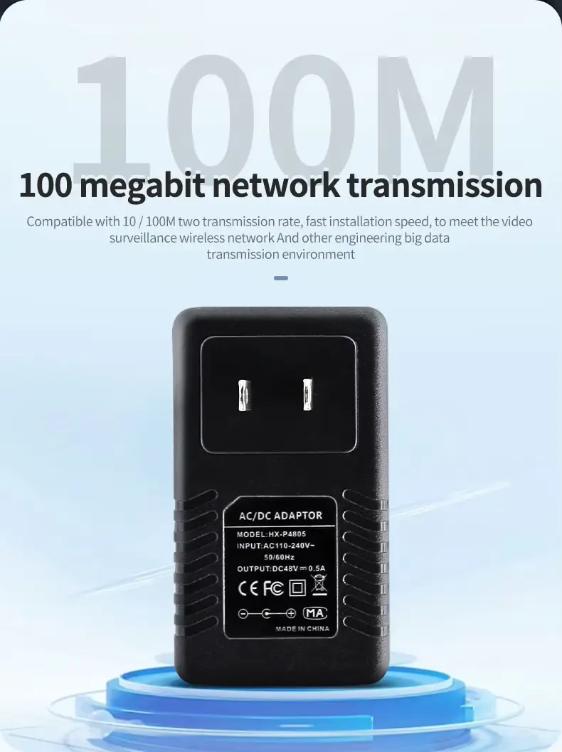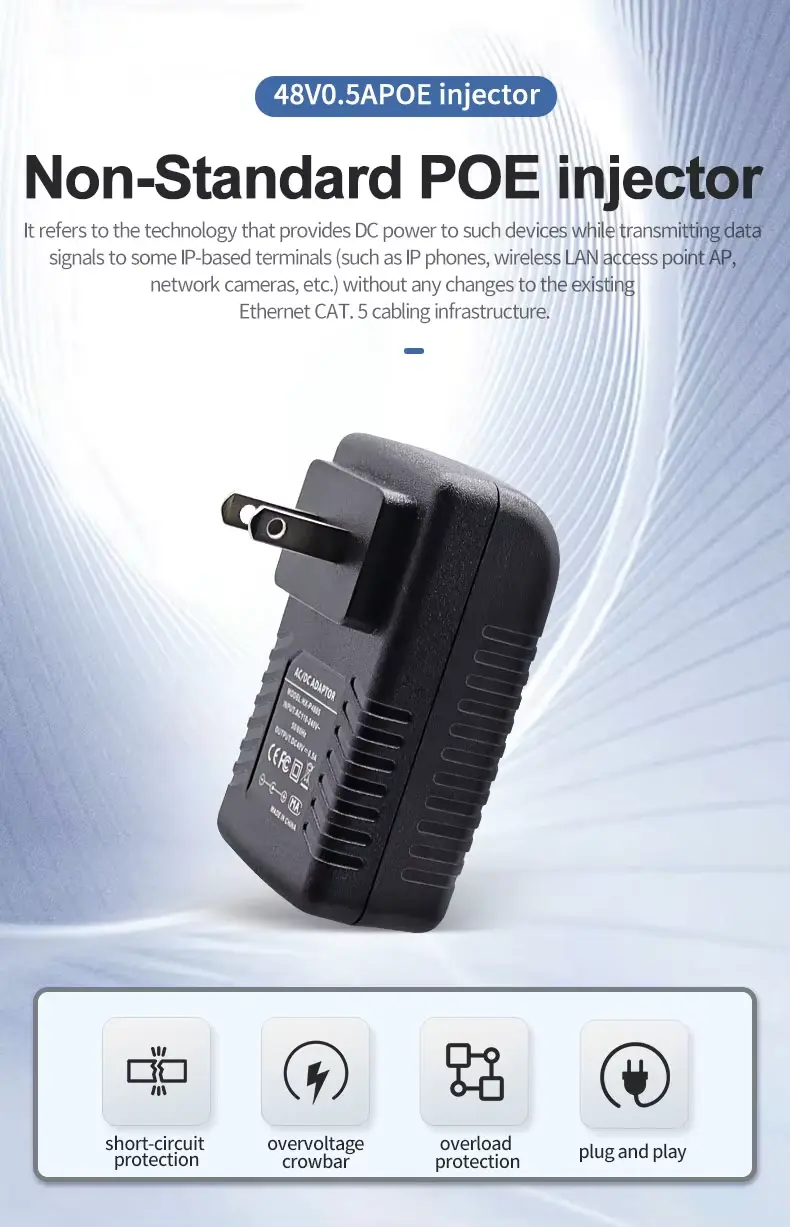 Um adaptador Ethernet injetor PoE de tomada de parede 48 V 0,5 A de alta qualidade é oferecido pelo fabricante chinês Starwell. Esta fonte de alimentação fornece uma potência de saída de 24 W (48 V/0,5 A), tornando-a particularmente adequada para dispositivos sem fio externos – como aqueles de marcas como Ubiquiti e MikroTik – bem como câmeras IP de longo alcance e pontes de rede. O produto possui múltiplos mecanismos de proteção contra sobretensão, sobrecorrente e curto-circuitos; ele opera em uma faixa de temperatura de -10°C a 60°C e vem com garantia de 5 anos.