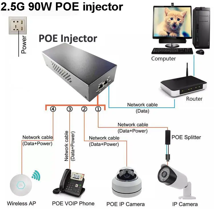 Adaptador PoE com injetor PoE de 48 V e 90 W da fábrica da Starwell, uma solução de alto desempenho projetada para fornecimento confiável de energia e dados via Ethernet. Totalmente compatível com os padrões IEEE802.3af/at/bt PoE++, este injetor garante transmissão estável de dados em alta velocidade de 2,5 G e pode alimentar dispositivos de alta demanda, como câmeras IP, APs sem fio, switches de rede e terminais IP. Seu design compacto plug-and-play simplifica a instalação em redes residenciais, de escritório e industriais, oferecendo fonte de alimentação PoE segura e eficiente com configuração mínima.