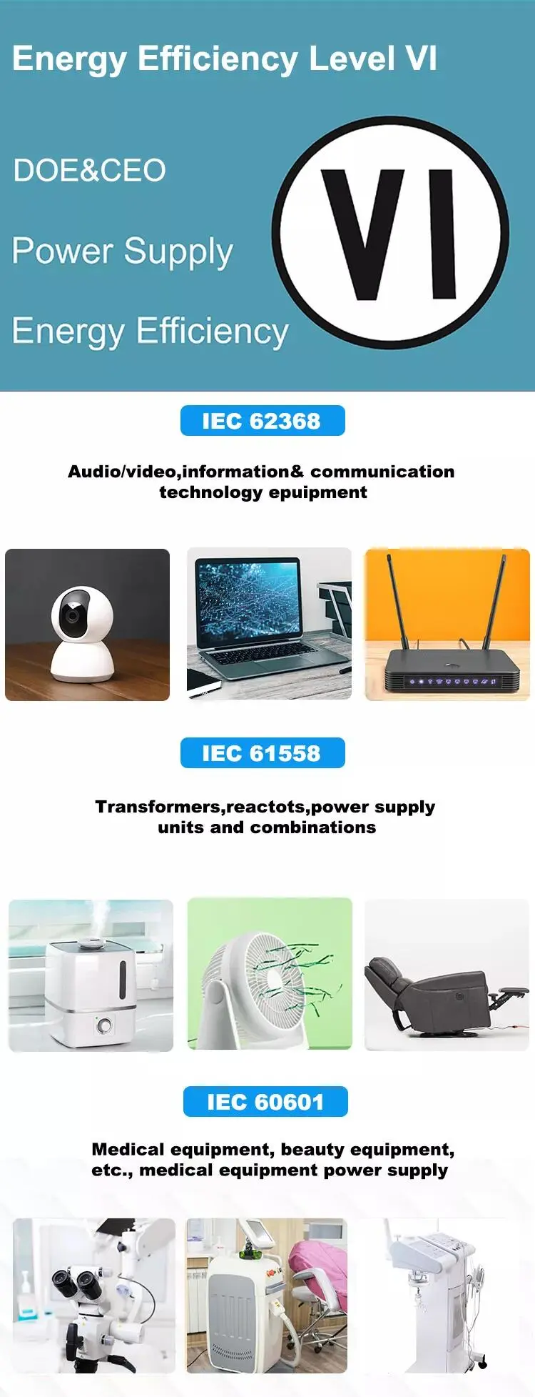 IEC62368 para eletrônicos de consumo, IEC60335 para carregador de bateria, IEC60601 para equipamentos de nível médico, IEC61558 para aplicação doméstica, IEC61347 para iluminação LED. |