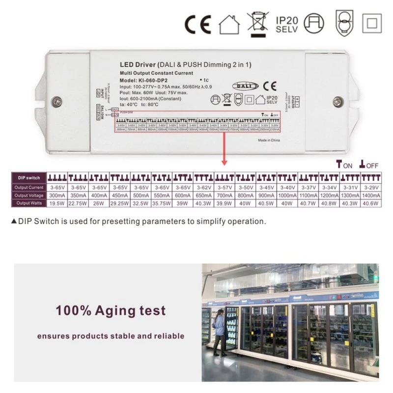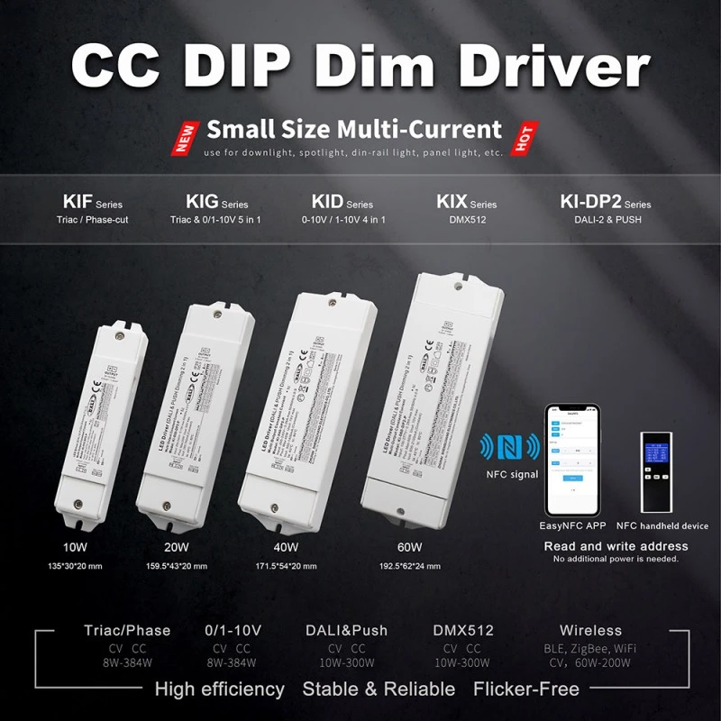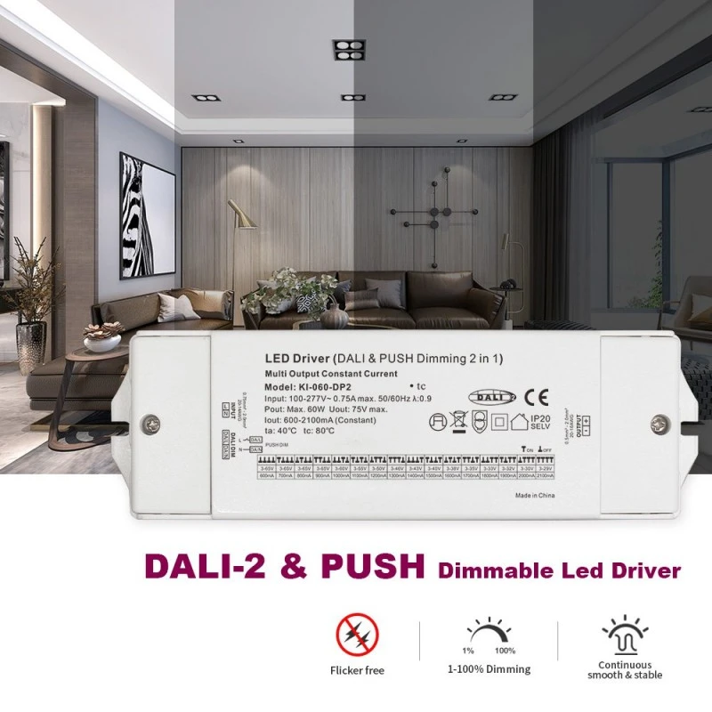 Como um driver de LED CCT DALI de corrente constante de 60W, ele adota tecnologia avançada de controle de corrente constante de circuito fechado para garantir que a corrente de saída (o valor típico é 700mA, que pode ser personalizado de acordo com os requisitos do módulo LED dos clientes) seja altamente estável. Este design evita efetivamente a atenuação da luz ou o desvio de cor causado pelas flutuações de corrente nos LEDs, garantindo fundamentalmente o brilho e a vida útil das lâmpadas a longo prazo. Sua ampla faixa de entrada de tensão e características de saída de corrente constante o tornam perfeitamente compatível com diversas especificações de downlights LED, refletores, luzes de painel, luzes lineares e módulos de faixa de luz.