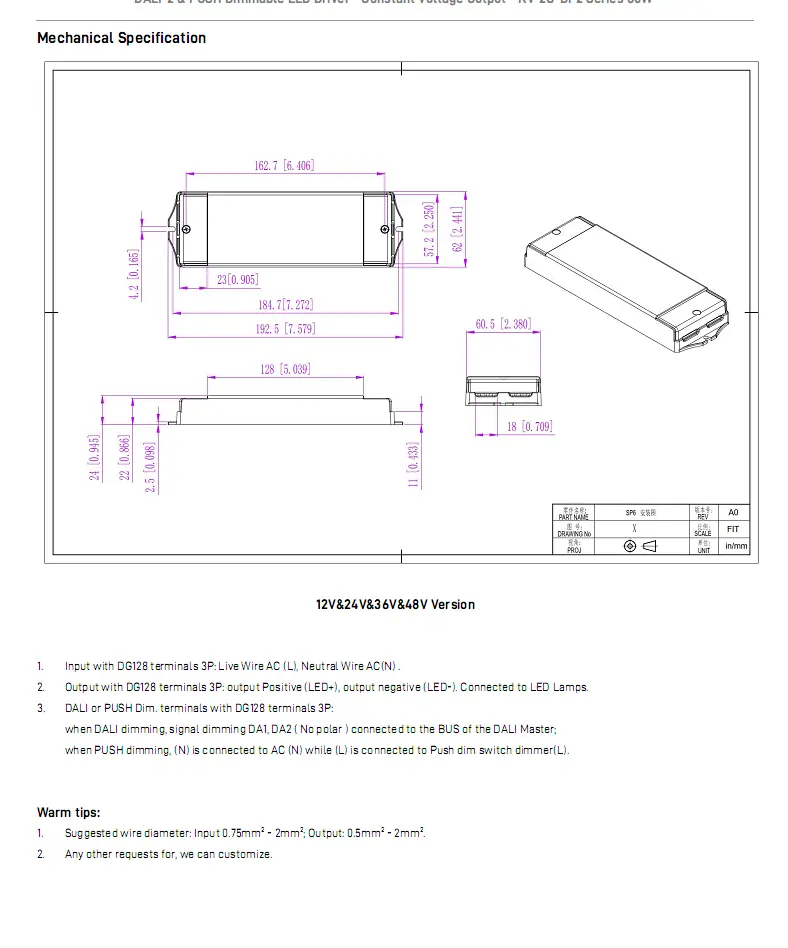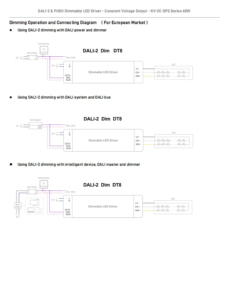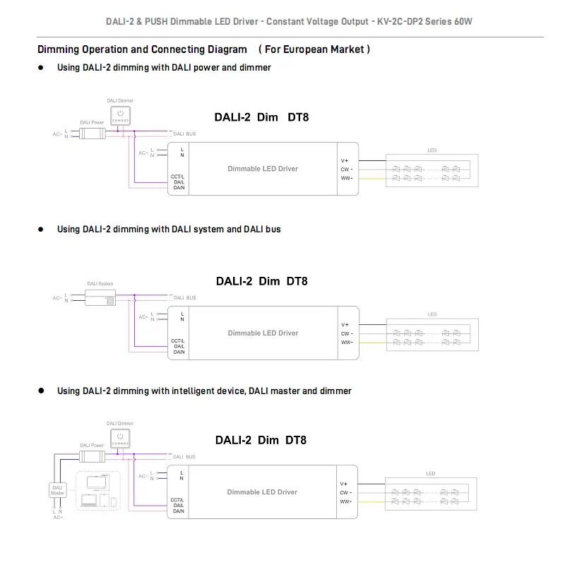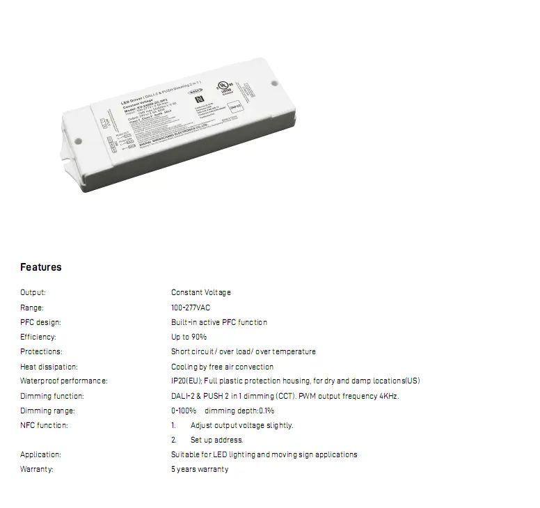 Alojado em uma caixa compacta e retardante de chamas, é adequado para iluminação comercial interna, como escritórios, hotéis e shopping centers. Com desempenho confiável e fácil integração de barramento DALI, permite controle inteligente de iluminação e gerenciamento de cena, ideal para projetos de iluminação branca ajustável de alta qualidade.