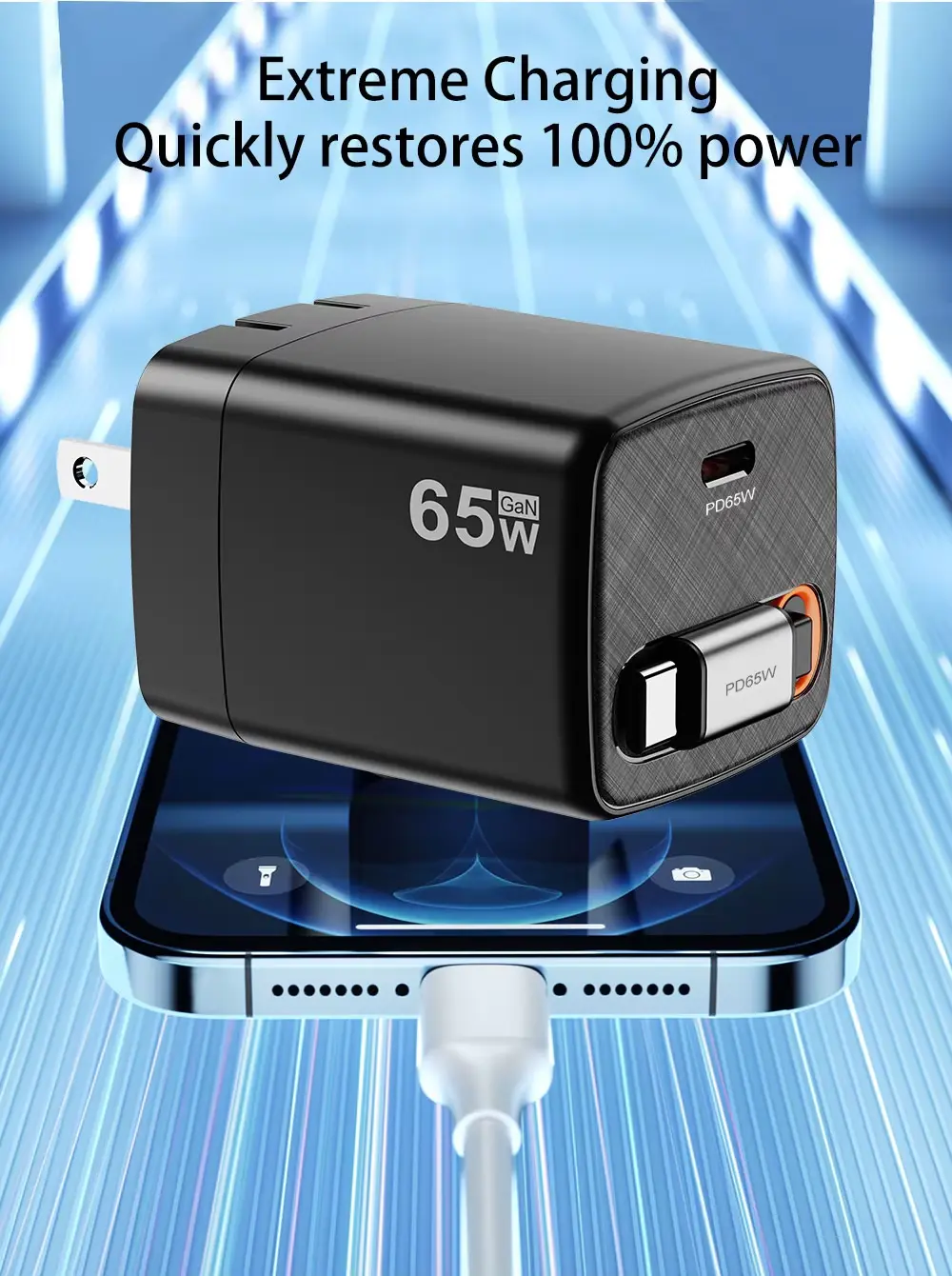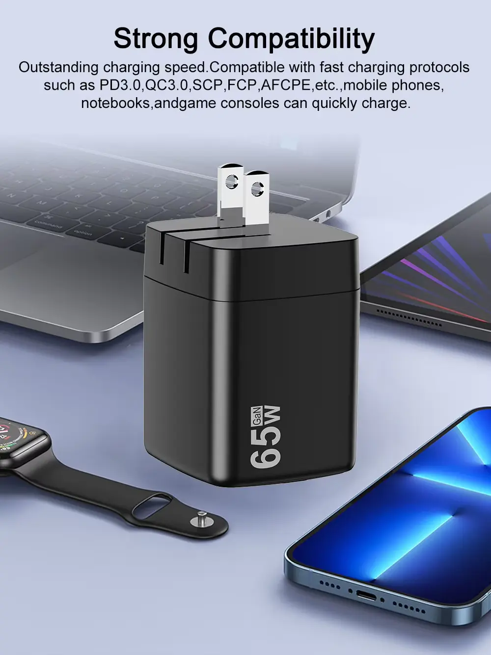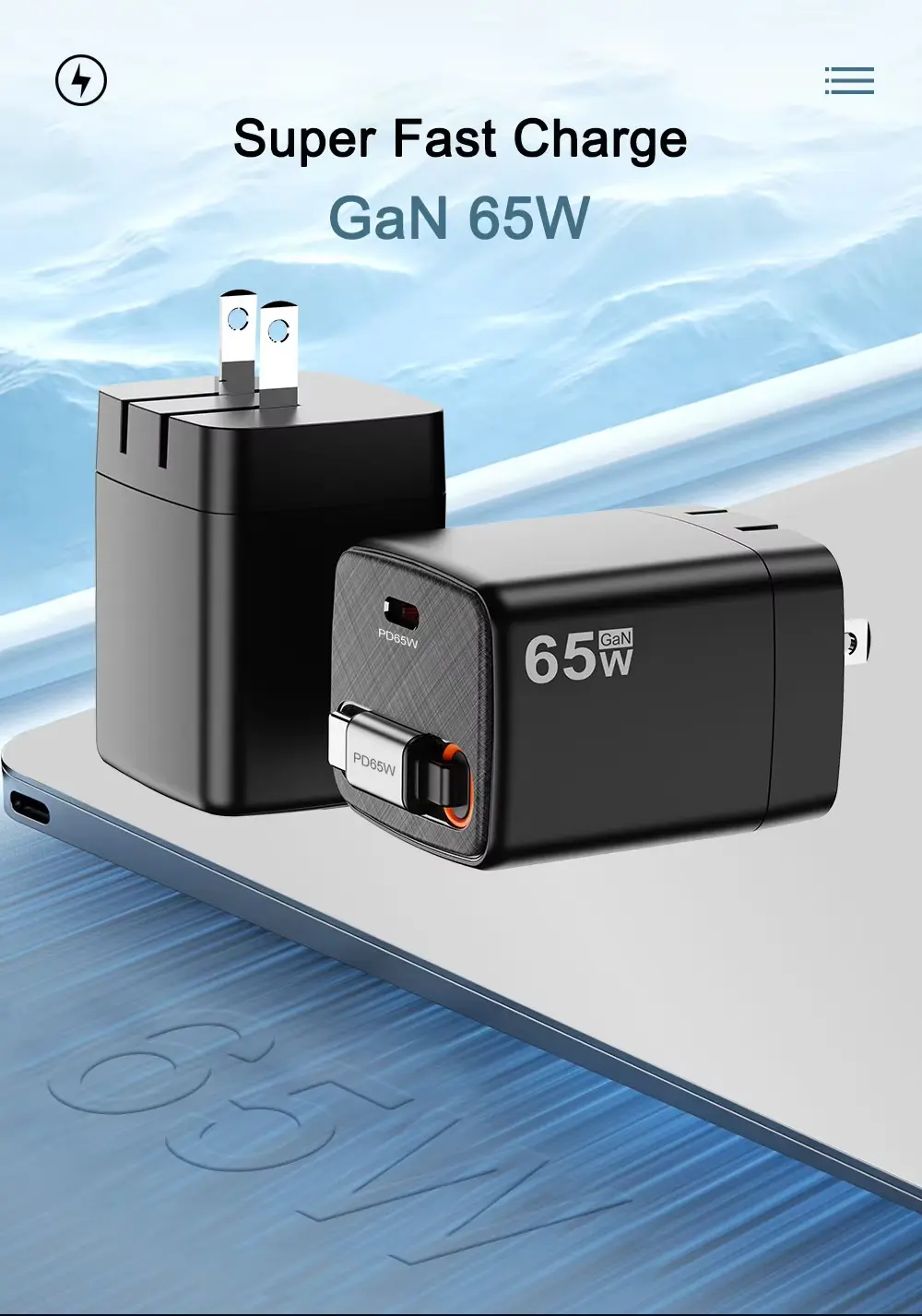 Carregamento de alta velocidade de 65 W: alimenta laptops e carrega telefones rapidamente.