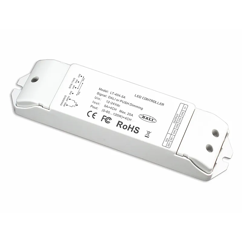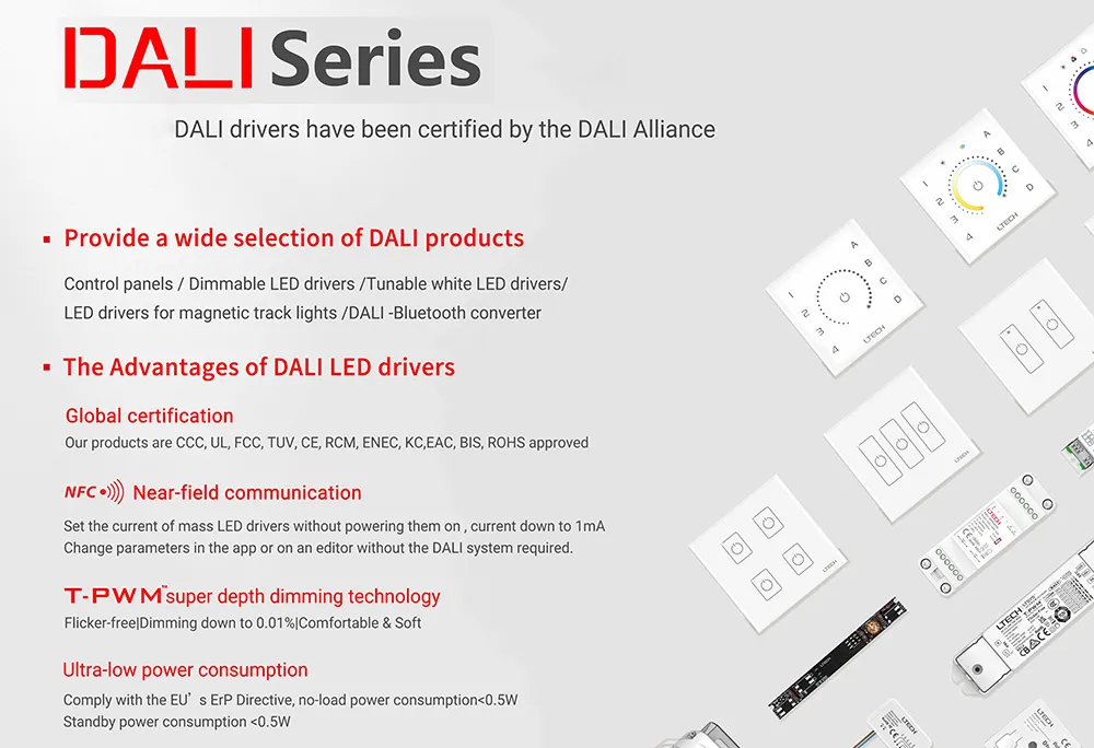 Controle avançado de dimerização DALI – Permite dimerização digital de 0,1% a 100% com alta resolução, suportando até 64 endereços DALI para controle individual ou de grupo em sistemas de iluminação automatizados.