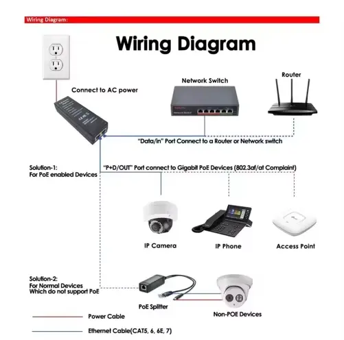 Integração de energia e dados: fornece energia estável de 48 V e dados completos de 1.000 Mbps em um único cabo Ethernet, eliminando fiação extra e tomadas elétricas para uma implantação mais limpa.