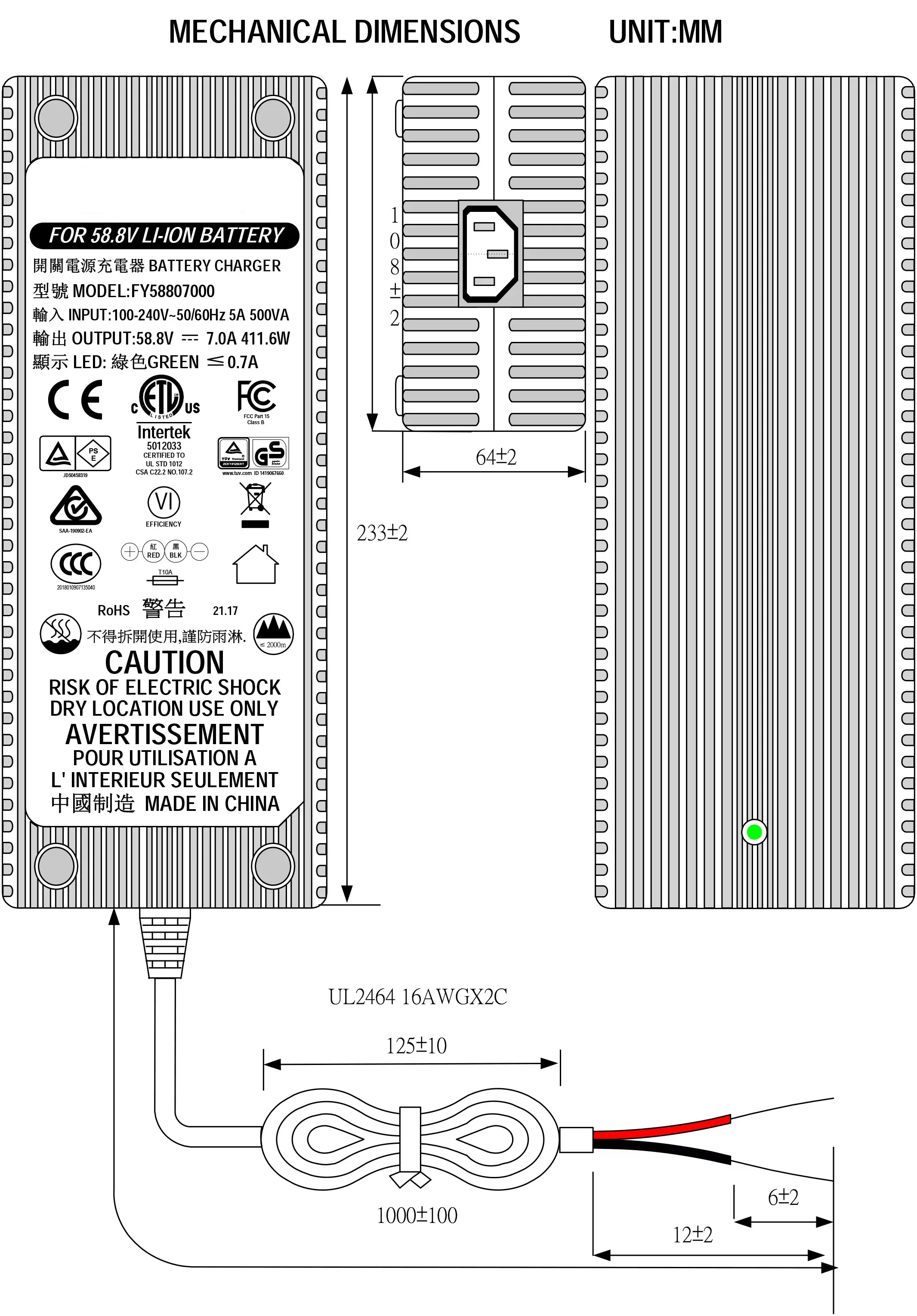 Certificado de acordo com os padrões UL, ETL, CUL, GS, CE, BS, SAA, KC, PSE, CB, FCC, EMC, RoHS, REACH, este carregador fornece energia eficiente, rápida e segura para aplicações exigentes de mobilidade elétrica.