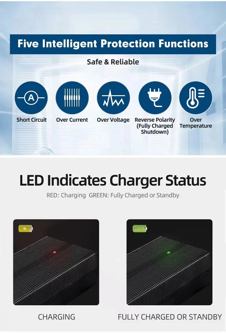 Compatibilidade global e segurança robusta: Apresentando uma entrada universal de 100–240 VCA, opera perfeitamente em todo o mundo. O carregamento inteligente avançado de três estágios (CC/CV) otimiza a saúde da bateria enquanto proteções abrangentes – incluindo curto-circuito, sobretensão, sobretemperatura e sobrecarga – garantem uma operação segura e sem preocupações. A caixa durável é construída com materiais à prova de fogo para maior confiabilidade em ambientes exigentes.
