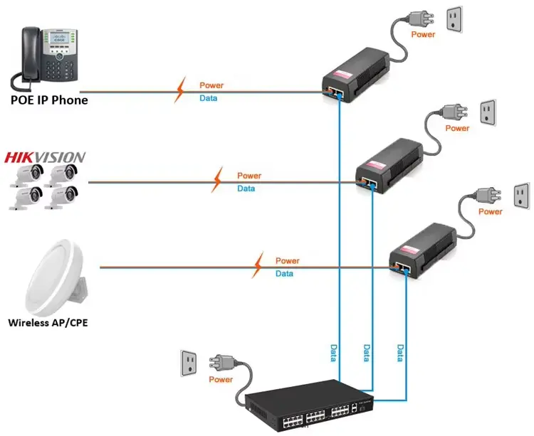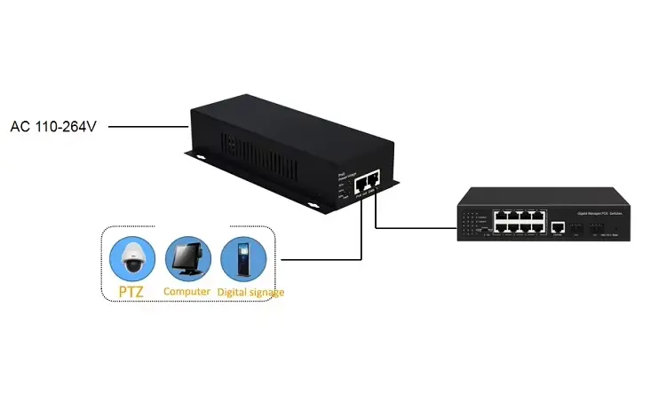 Requisito de cabeamento: para entrega total de 90 W em distâncias mais longas (até 100 m), é altamente recomendado usar cabo Ethernet Cat6a (ou superior) para minimizar a perda de energia e a geração de calor.
