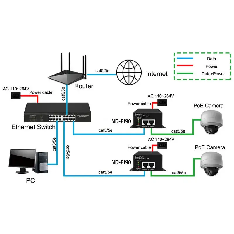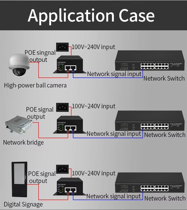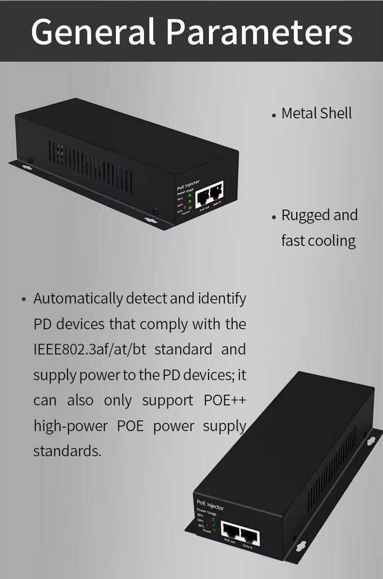 * Compatível com classificação de protocolo padrão IEEE802.3bt Classe 8. * Reduza a demanda por adaptadores e cabos de energia volumosos e reduza os custos de fiação. * Ampla faixa de entrada de tensão CA de 100-240V. * Suporta largura de banda de rede de 10/100/1000Mbps.