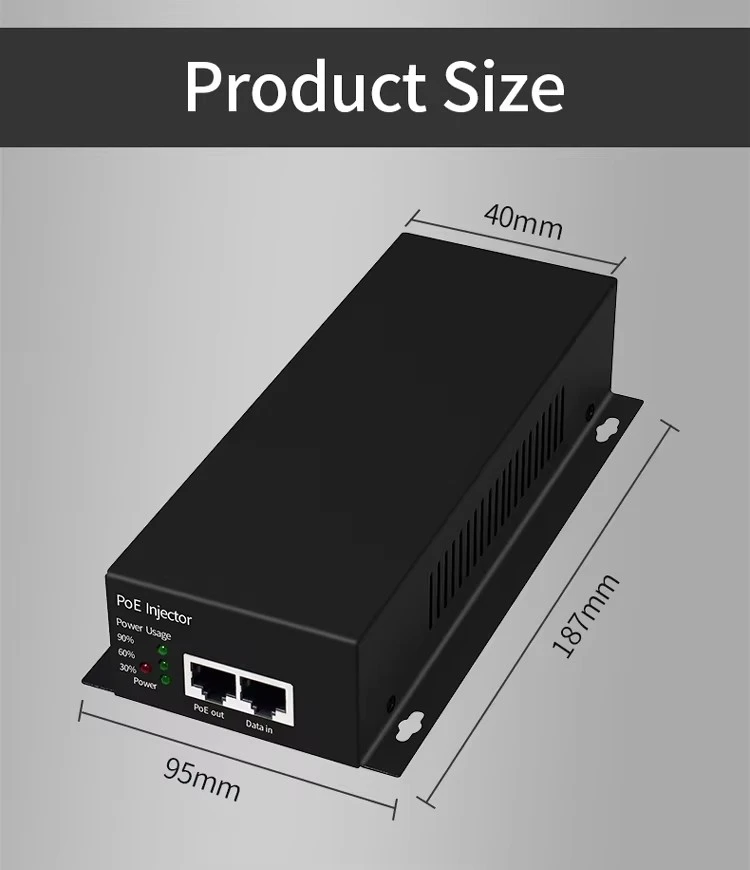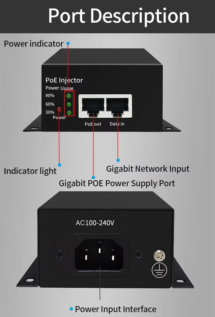 Desempenho de energia confiável Com uma faixa de tensão de entrada de AC100-240V e uma saída DC48V1.25A estável, o injetor POE alimentado por bateria fornece energia PoE de 48V limpa e consistente para dispositivos conectados. Ele suporta a configuração principal da linha de energia de 1/2,4/5(+) e 3/6,7/8(-), garantindo ampla compatibilidade com vários dispositivos alimentados por PoE na extremidade receptora.