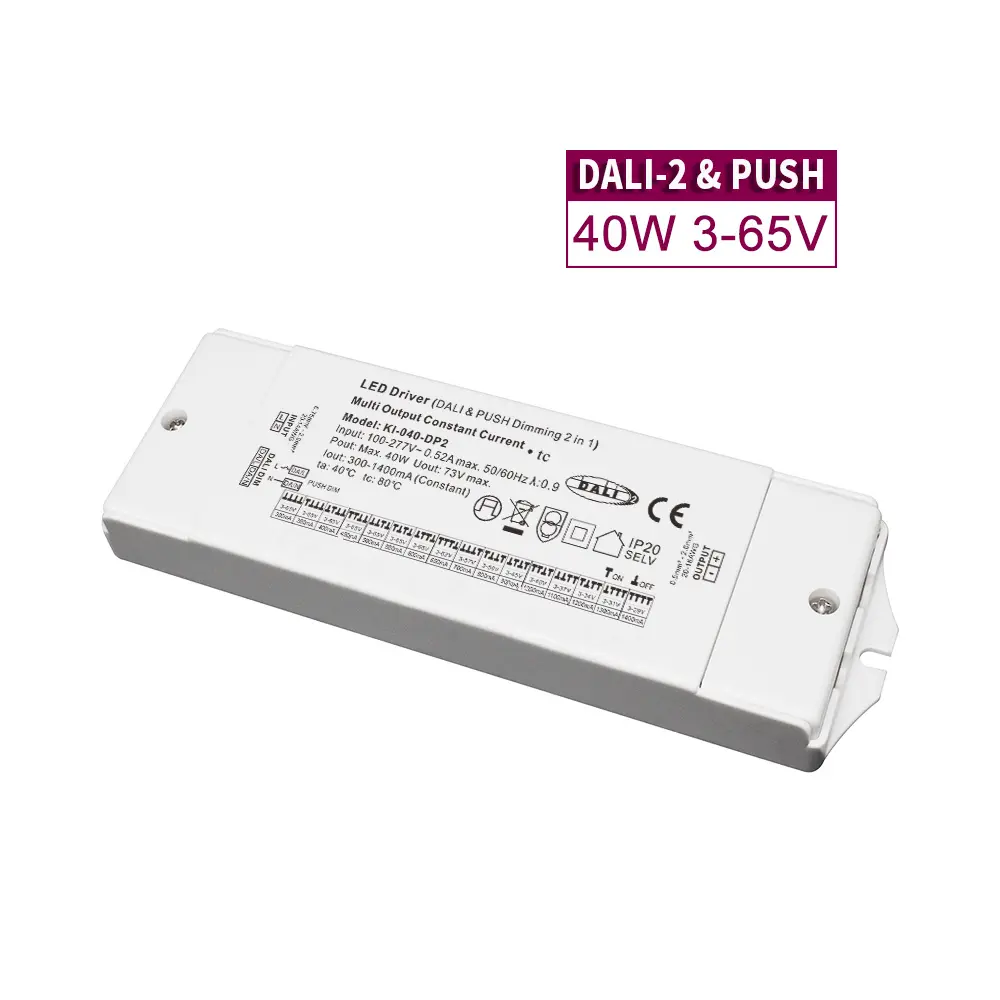 Nosso driver se destaca em flexibilidade de controle. Integra-se perfeitamente em qualquer ecossistema DALI-2 (protocolo IEC 62386), permitindo regulação avançada de intensidade, agrupamento e configuração de cenário para uma gestão inteligente de edifícios. Para configurações mais simples, a função de dimerização PUSH integrada oferece uma opção conveniente de controle manual. Escolha entre logarítmico (padrão) para um escurecimento perfeito centrado no ser humano ou curvas lineares para atender às necessidades específicas da aplicação. Esta combinação garante forte compatibilidade e escurecimento extremamente suave e sem cintilação, de 100% até os níveis mais baixos.