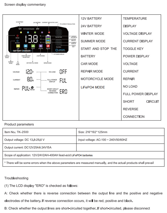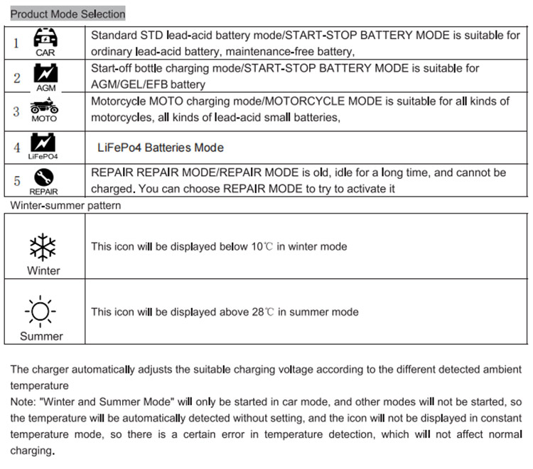 Amplo suporte para tipos de bateria: compatível com vários produtos químicos de bateria, incluindo baterias padrão inundadas (úmidas), AGM (tapete de vidro absorvente), gel e cálcio, garantindo carregamento ideal para cada tipo específico.