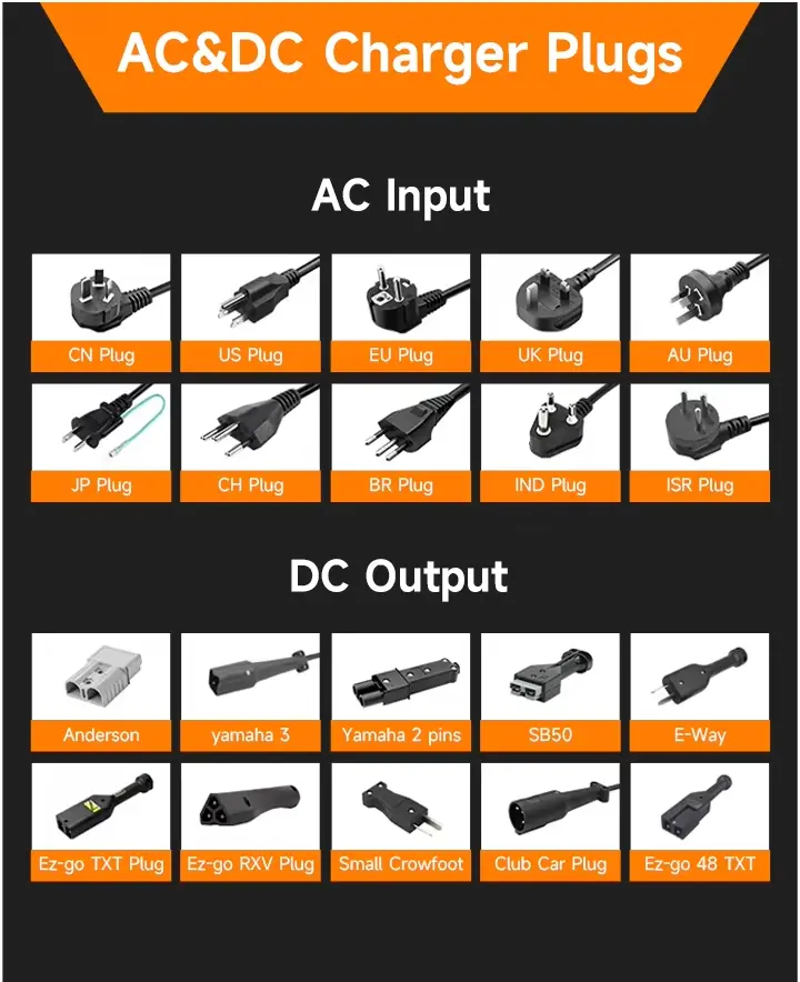 O plugue da UE, geralmente para países da UE, como Alemanha, França, Holanda, Dinamarca, Áustria, Suécia, etc. O plugue do Reino Unido, geralmente para Grã-Bretanha, Índia, Paquistão, Cingapura e etc. O plugue AU, geralmente para Austrália, Nova Zelândia, Argentina e etc. Os conectores DC comuns no mercado incluem Anderson, EZ-go, DS Club Car e Yamaha Connector, etc.