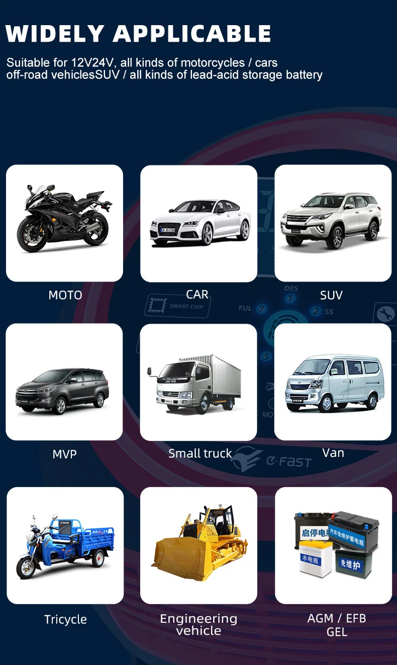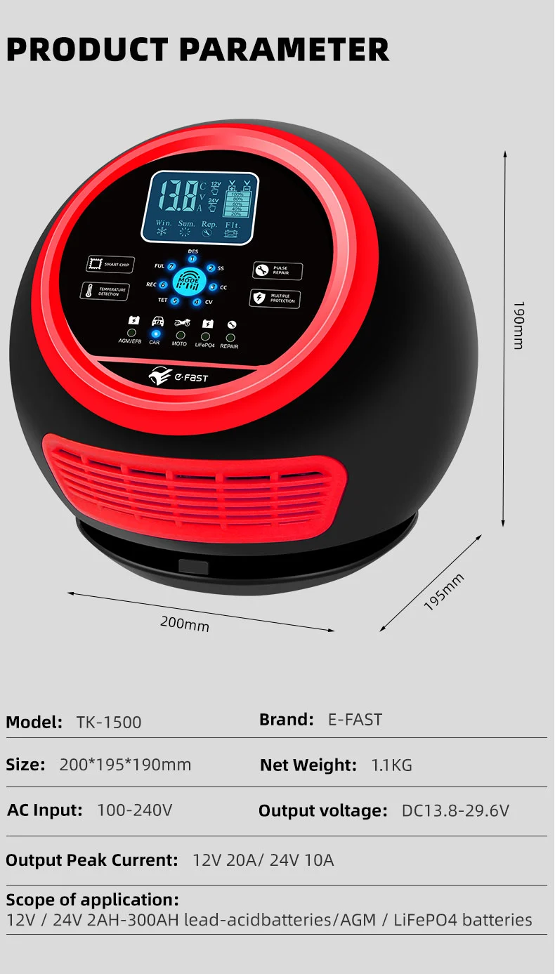 O TK-1500 é um poderoso carregador de bateria totalmente automático, que oferece dois modos de carregamento: 12V/20A e 24V/10A. Ele é projetado especificamente para automóveis, caminhões, motocicletas, barcos, cortadores de grama, SUVs, trailers, tratores e todos os tipos de scooters. Quer sejam baterias tradicionais de chumbo-ácido (inundadas, AGM, gel, ciclo profundo, baterias de cálcio) ou baterias avançadas de fosfato de ferro-lítio (LiFePO4) e baterias de íon-lítio, o TK-1500 pode identificar e combinar de forma inteligente a melhor curva de carga, alcançando verdadeiramente a funcionalidade multifuncional em um único dispositivo.