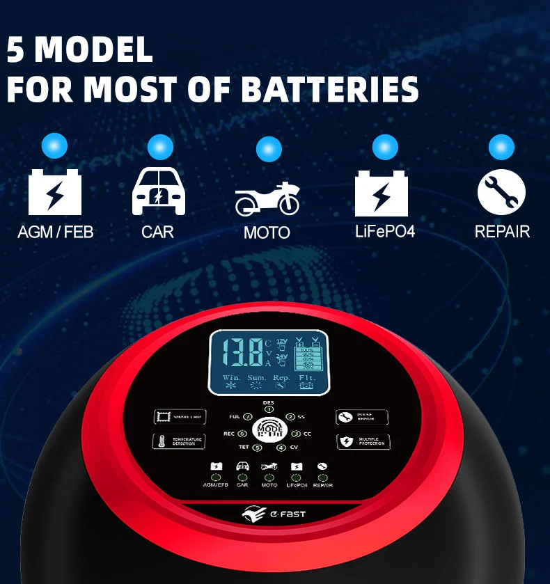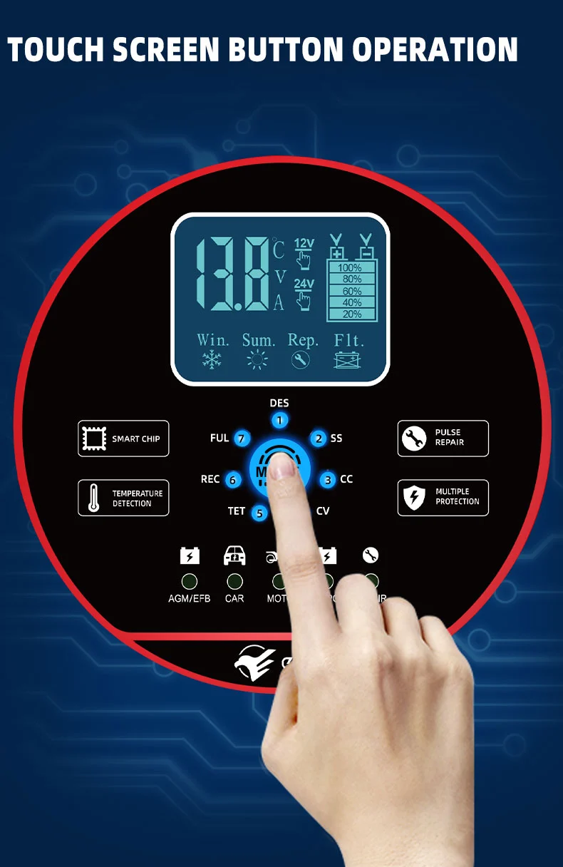Este carregador apresenta um design compacto e inovador e está equipado com um display LCD de alta definição que mostra tensão, corrente, temperatura, progresso de carregamento e status da bateria em tempo real, tornando a operação clara num piscar de olhos. Possui uma função de reparo de pulso integrada que pode ativar e reparar baterias antigas, prolongando sua vida útil. Como um carregador inteligente totalmente automático, o TK-1500 suporta a operação "conectar e esquecer": ele detecta automaticamente a tensão da bateria, seleciona o modo de carregamento e muda para um modo de manutenção de carregamento flutuante após a carga completa para evitar sobrecarga. É ideal para manutenção de baterias de veículos que ficam estacionados por longos períodos ou equipamentos sazonais como cortadores de grama e barcos.